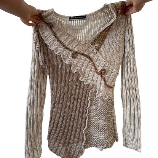 Vintage French asymmetric rib-knit sweater with mixed textures (Small)