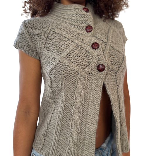 Vintage French chunky cable-knit cap-sleeve buttoned sweater in oatmeal (Small)