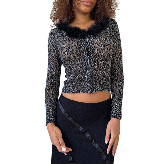 Vintage French sheer black lace button-front top with feather collar (XS/S)