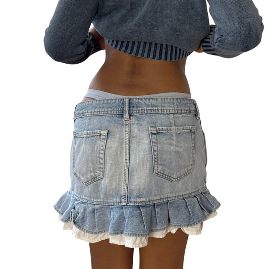 Vintage Low-Rise Light Wash Blue Denim Ruffle Hem Mini Skirt (Small)