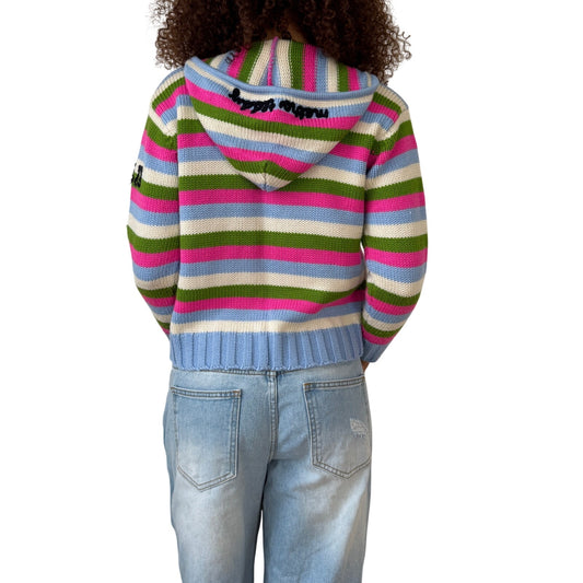 Vintage Euro striped knit zip-up hoodie with ribbed panels & logo detail (Small)