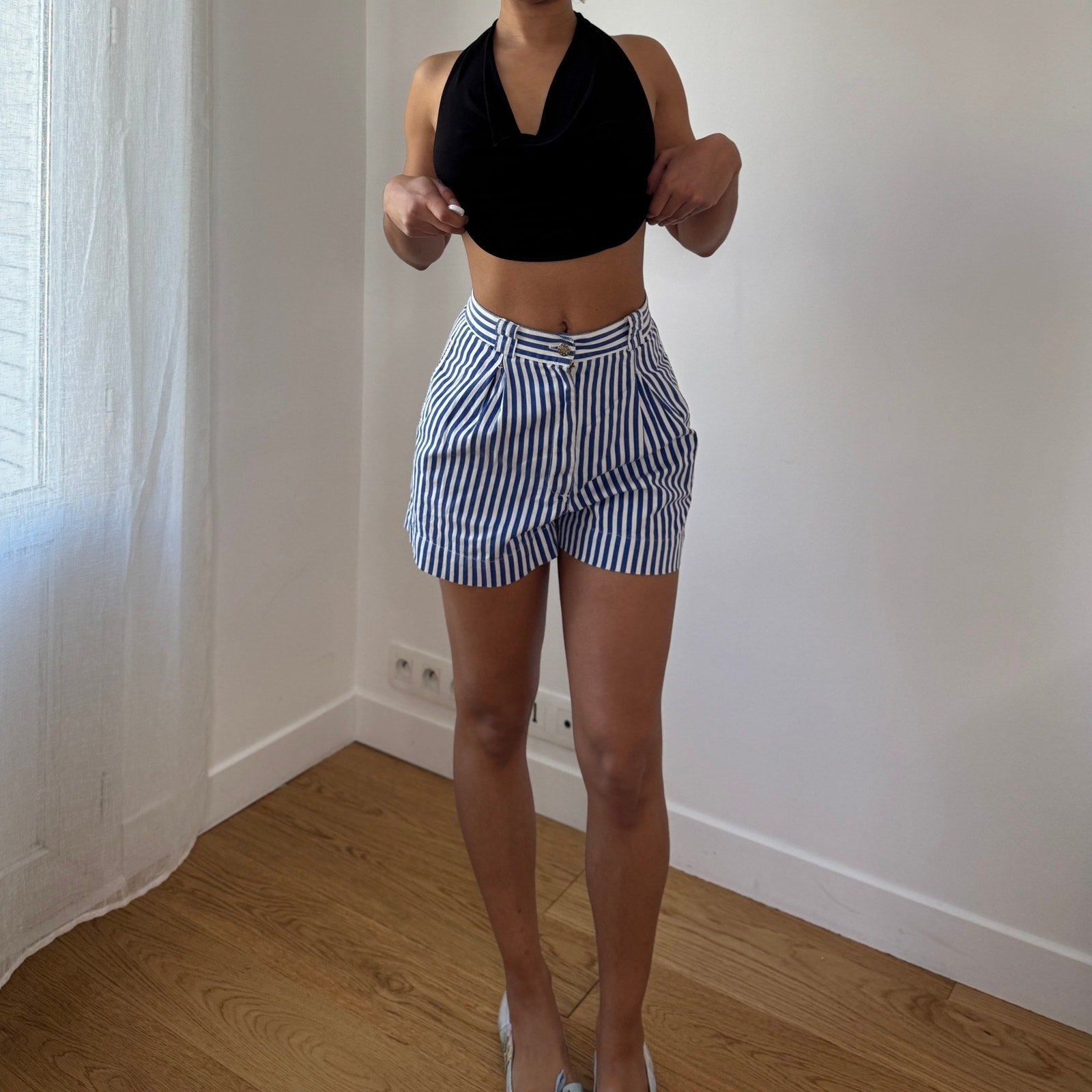 Vintage Blumarine shorts in probable cotton. Navy and white vertical stripe, high-rise fit, pleated front, silver-tone button closure, side pockets. Fabric is crisp and structured with minimal stretch. Free shipping on bundles <3