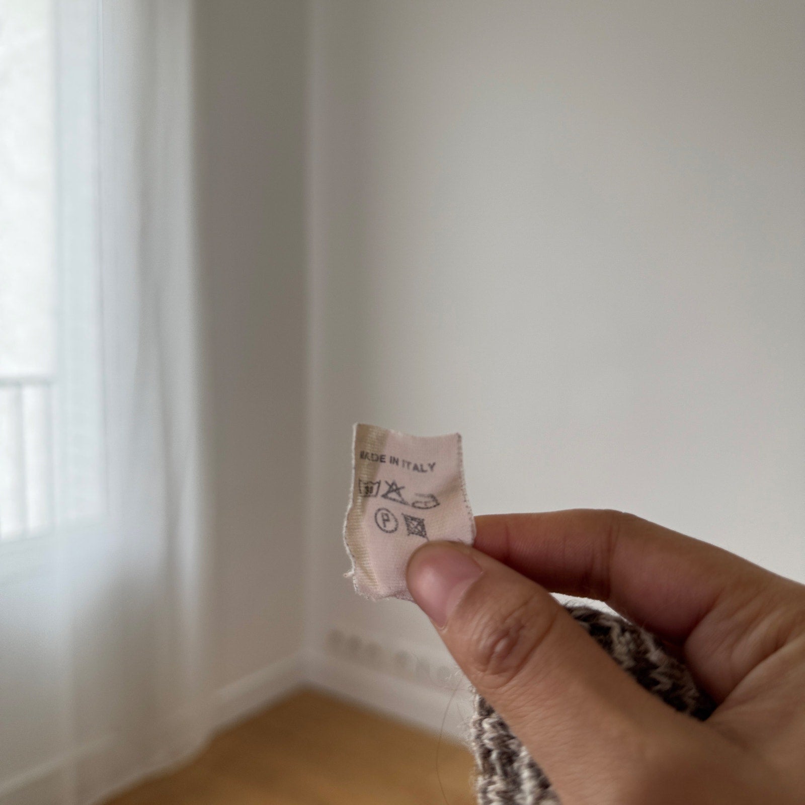 French vintage knit sweater crafted from a wool, alpaca, viscose, and acrylic blend featuring a textured ribbed knit pattern with notched neckline and fitted silhouette. Midweight knit with soft stretch and clean cropped fit. Made in Italy.
