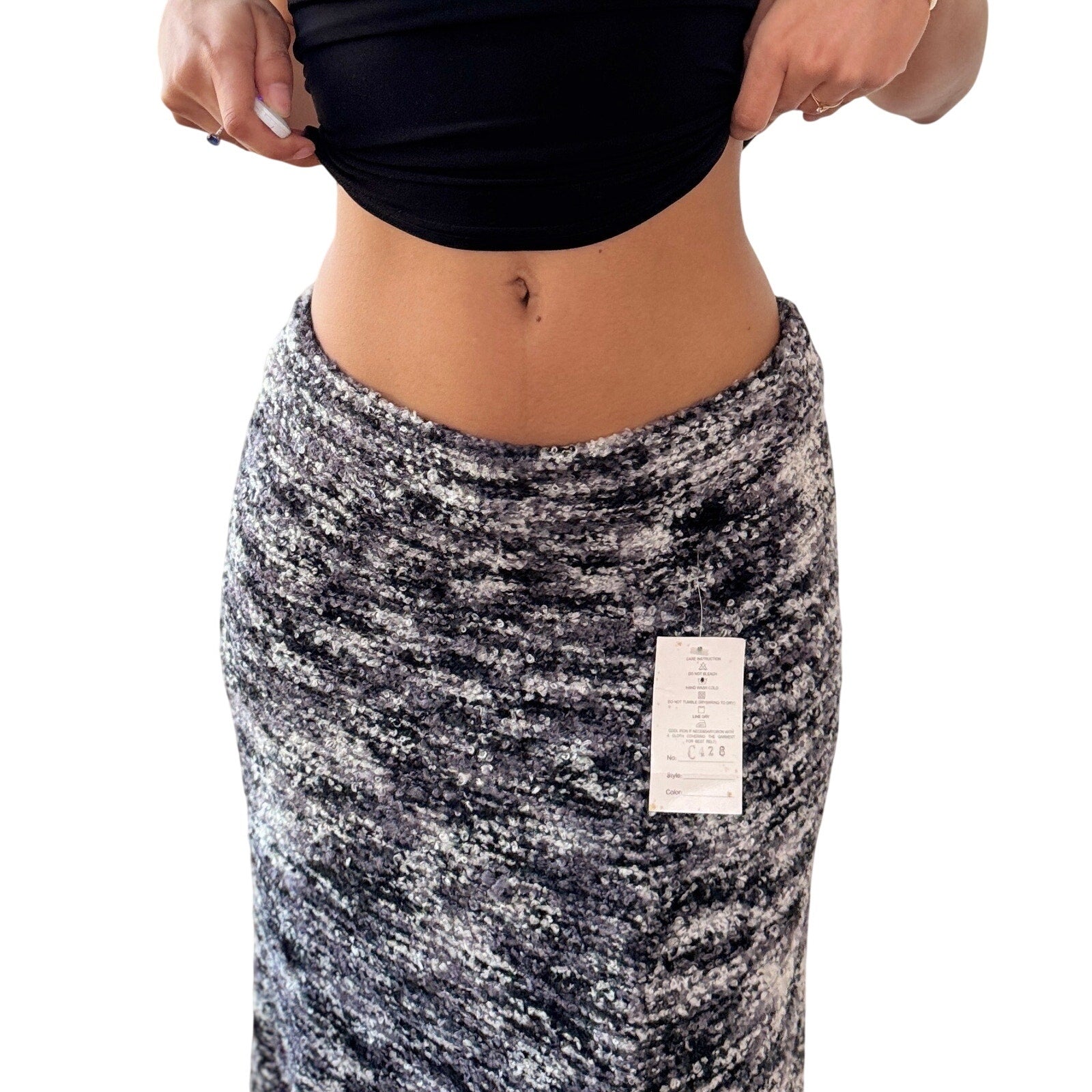 Vintage Grey Marled Knit Midi Skirt Fringe Hem Wool Cotton Deadstock (S)