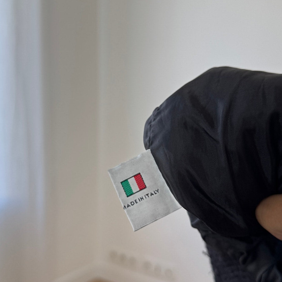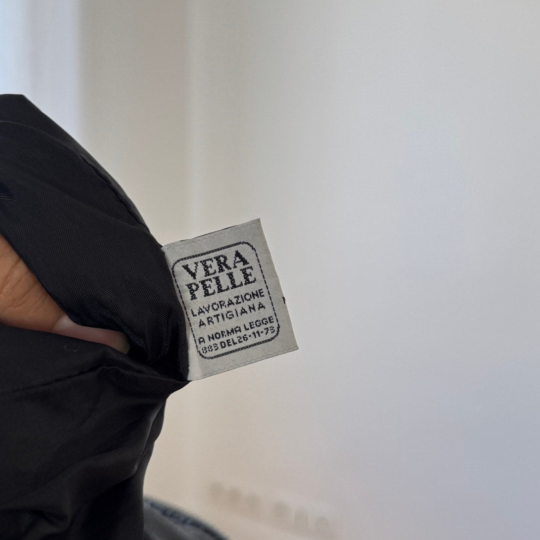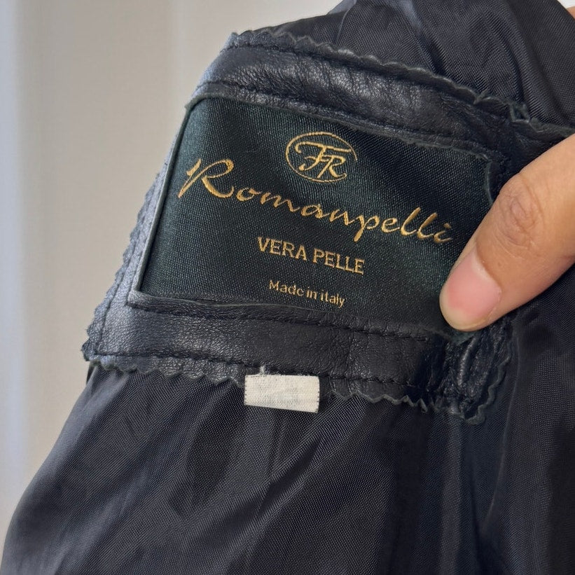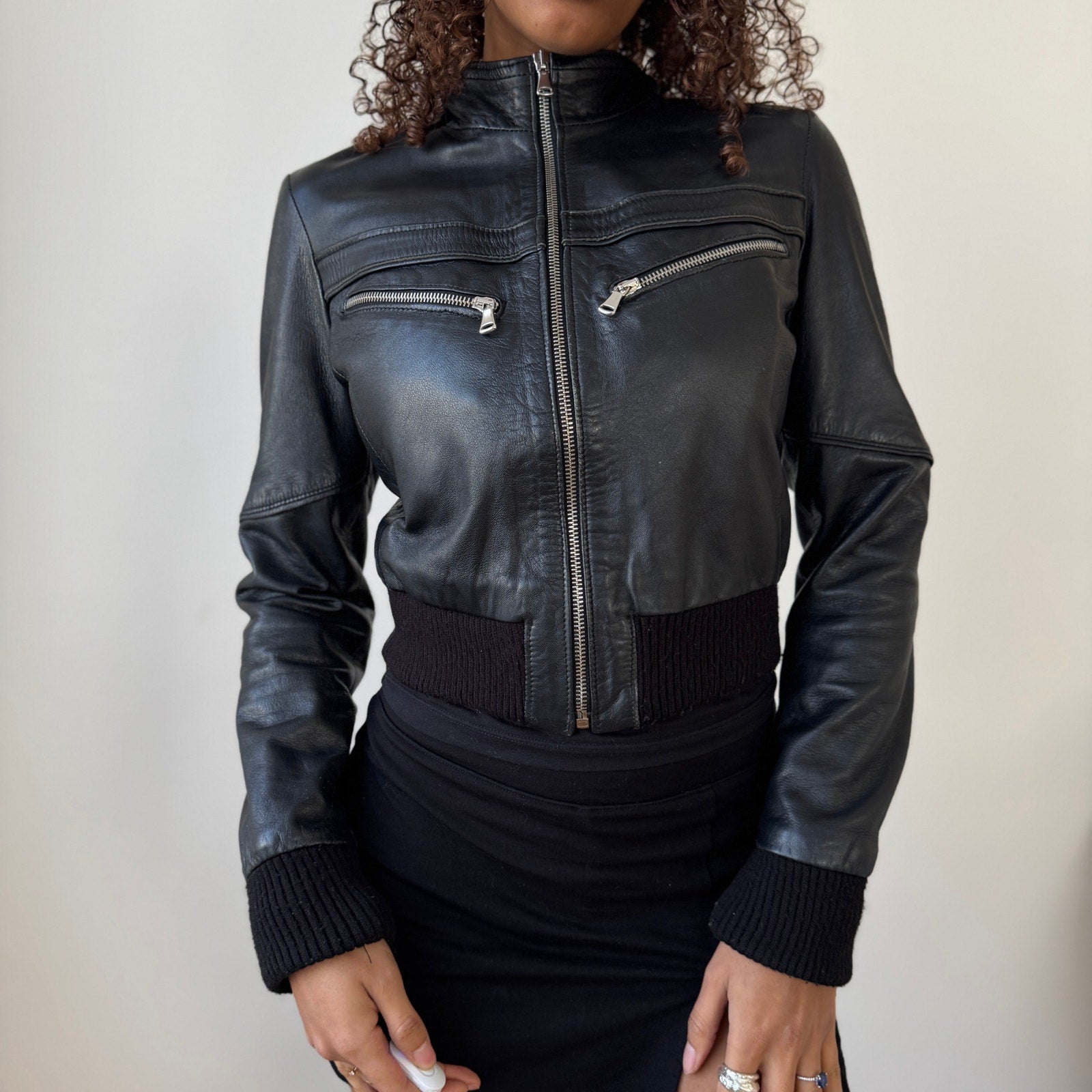 GORGEOUS vintage Italian black 100% real leather jacket with a clean zip front, zip chest pockets, and ribbed knit cuffs and waistband. Structured cropped fit with a sleek, minimal silhouette. Made in Italy.