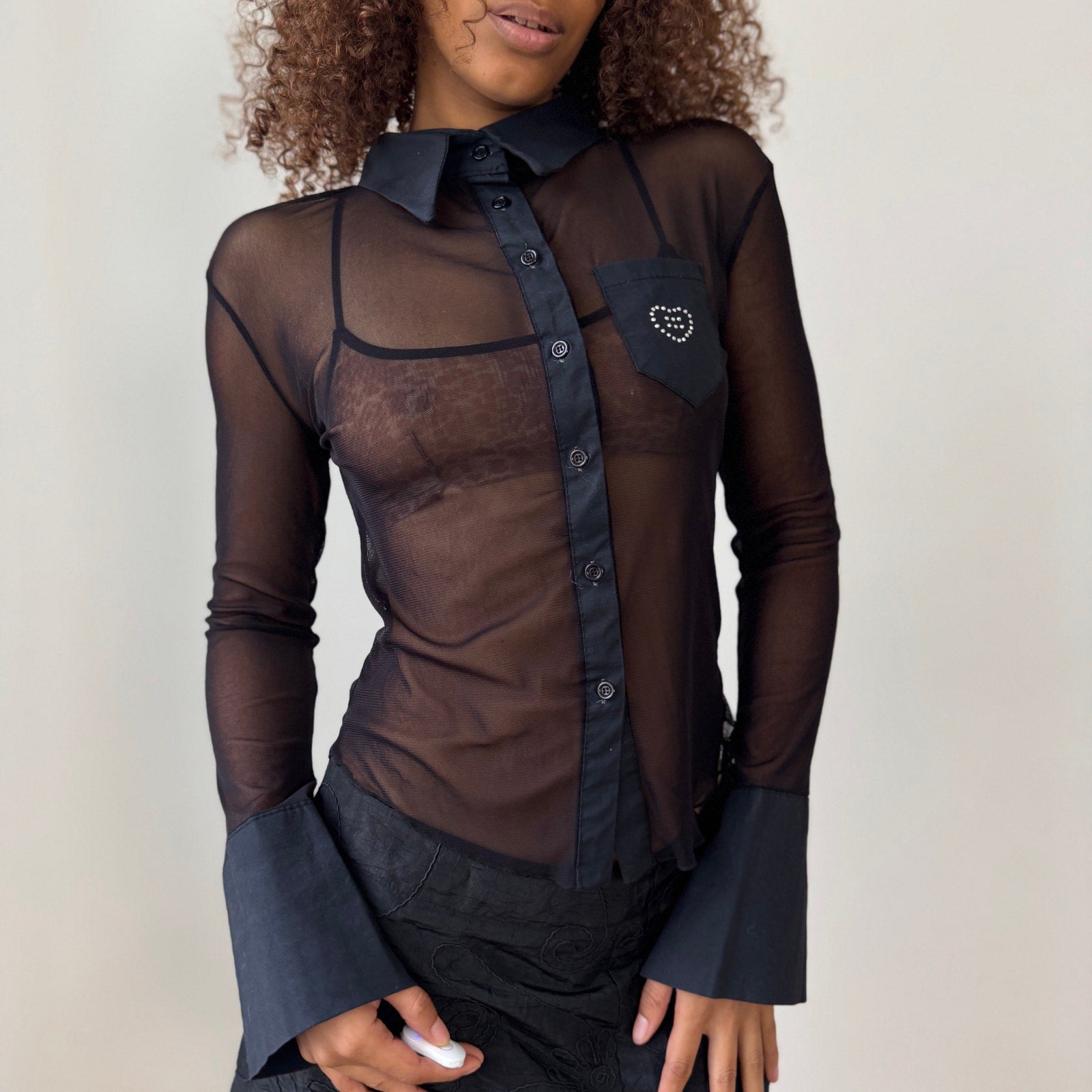 Semi-sheer mesh with contrast collar/placket/cuffs and a rhinestone heart chest pocket. Button-front, flared cuffs; stretchy, unlined. Bralette not included.
