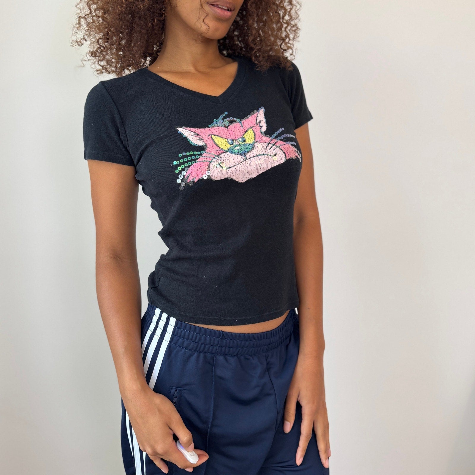 Soft stretch jersey with oversized sequin cat graphic; v-neck, cap sleeves, light baby-tee crop.