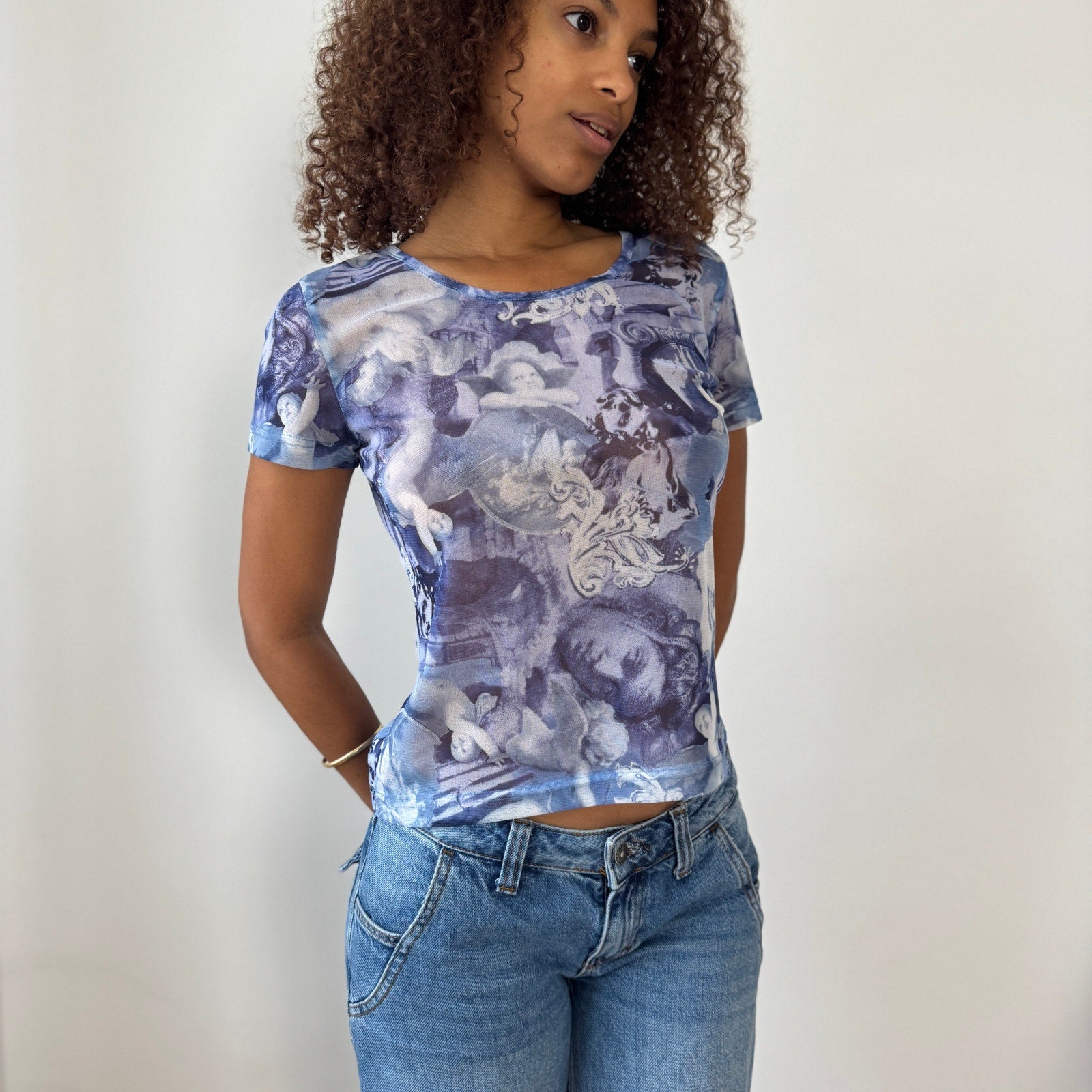 Italian Vintage Semi-Sheer Mesh Renaissance Print Baby Tee (Small/Medium)