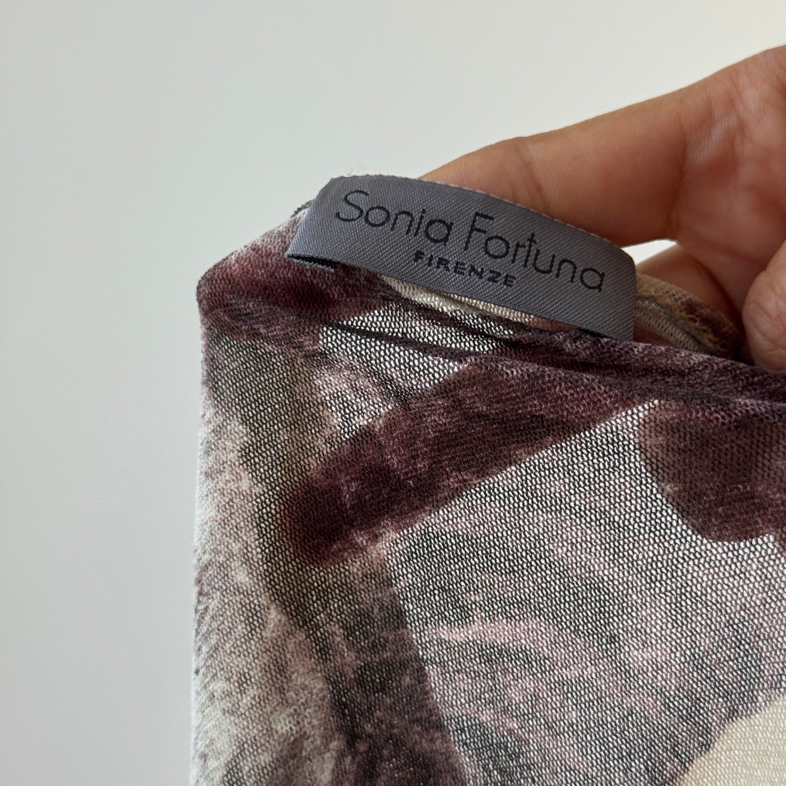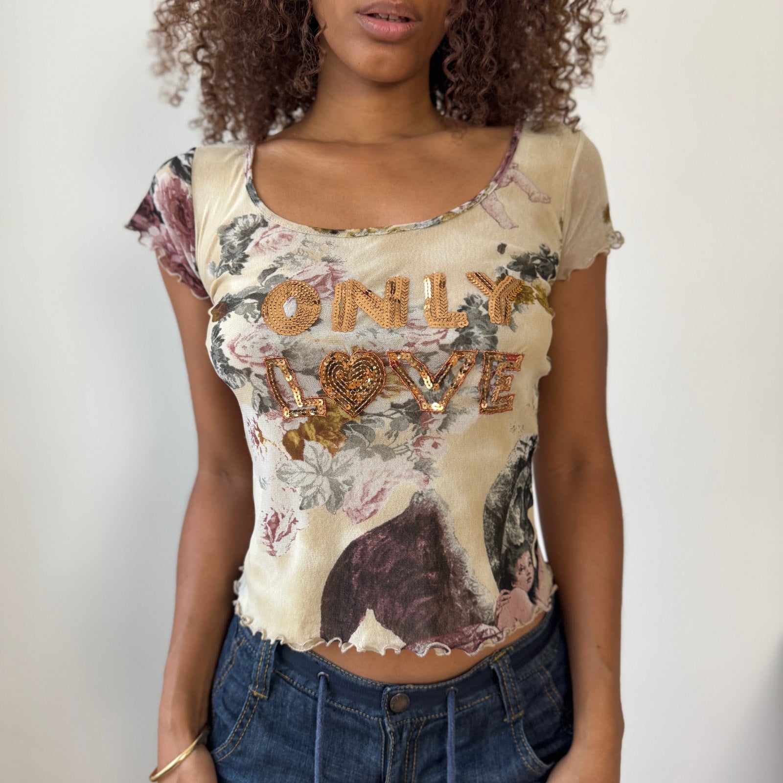 Stretch mesh with collage floral/cherub print and sequin “ONLY LOVE” lettering; lettuce hems. Made in Italy.
