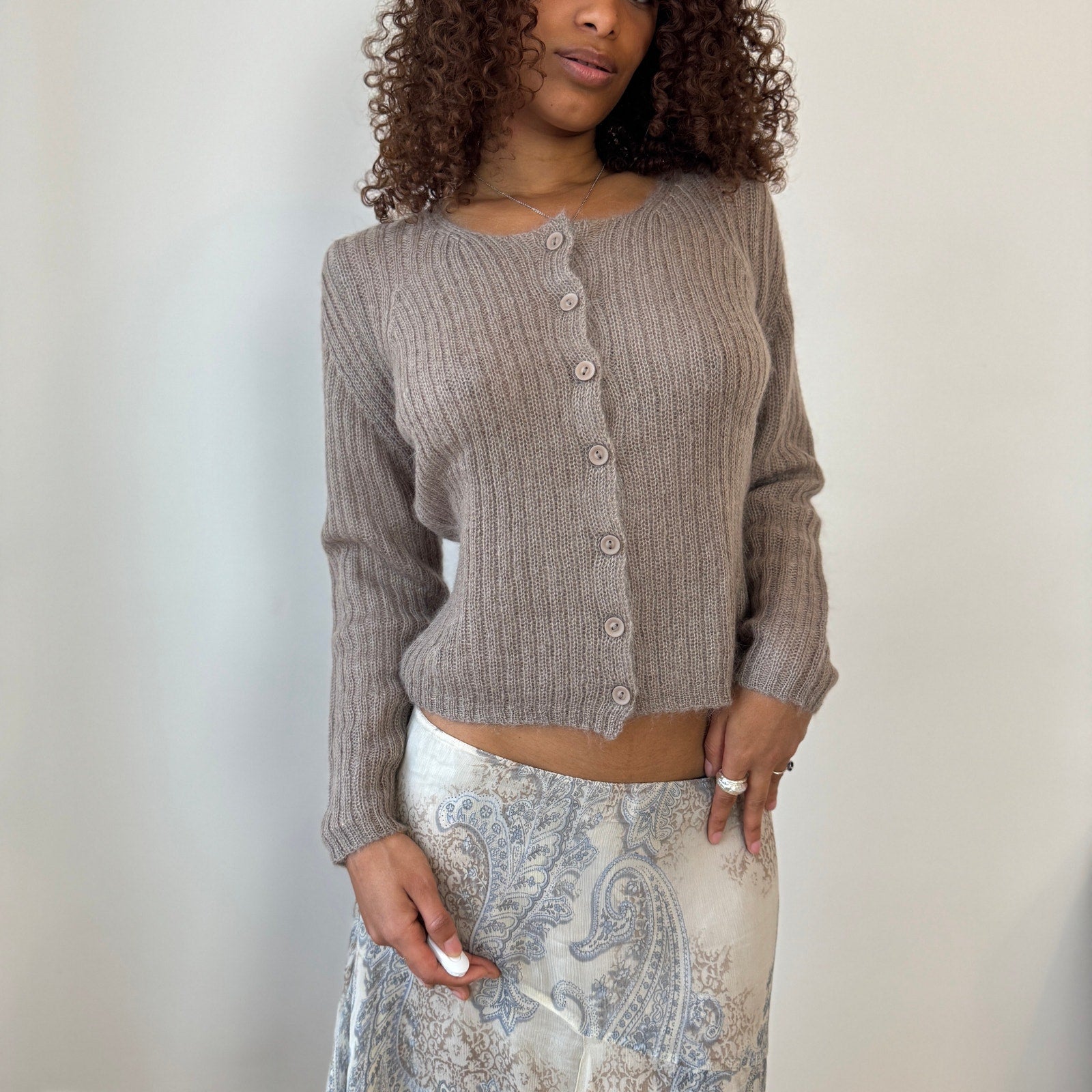 Soft Italian vintage cardigan in a warm taupe mohair-blend knit with fine vertical ribbing throughout. Button-front closure with a clean crew neckline; stretchy, body-skimming fit with a lightweight, cozy handfeel. Made in Italy.