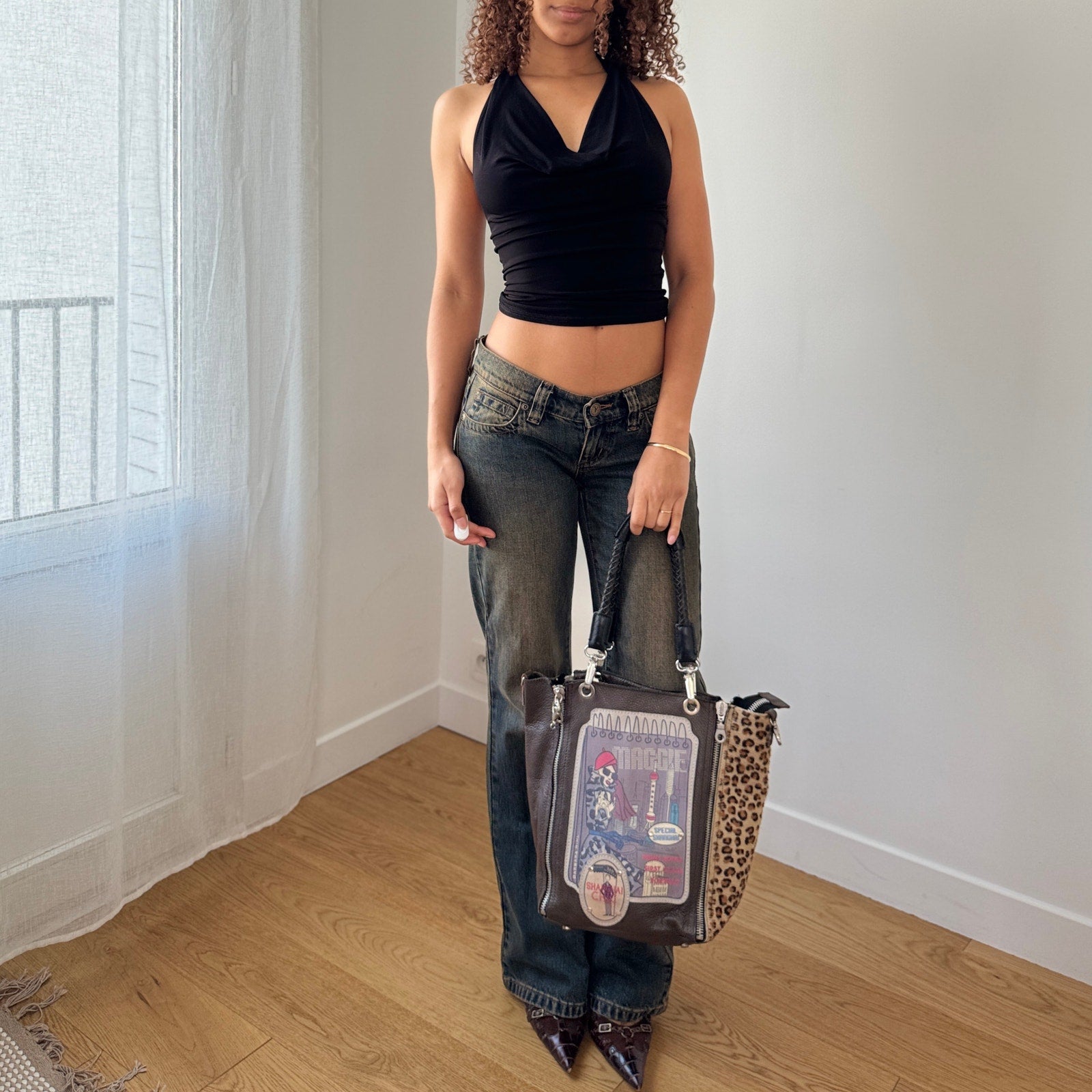 Vintage Barbara Rihl limited edition illustrated shoulder bag crafted from 100% real leather featuring mixed panel design with illustrated front graphic, leopard print side panel, and zip pocket detailing. Structured leather body with braided top handles and interior zipped pocket.