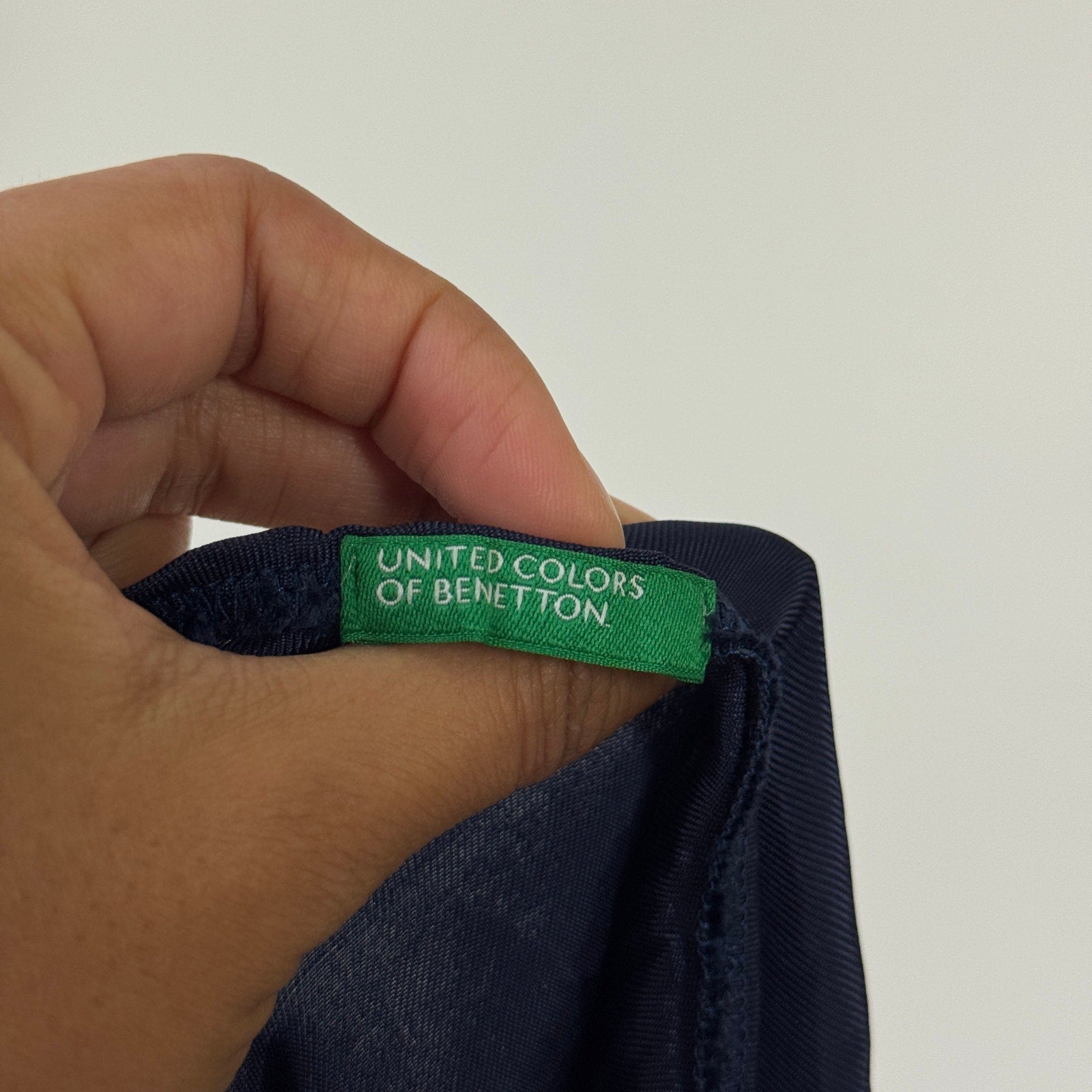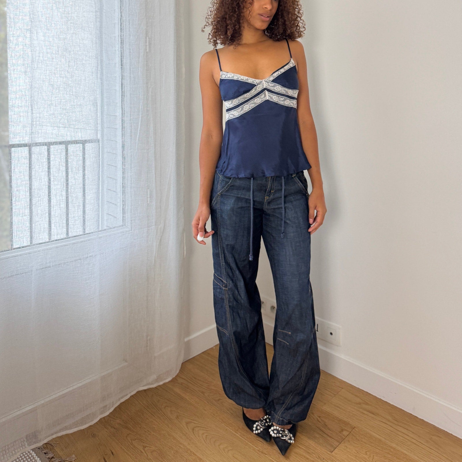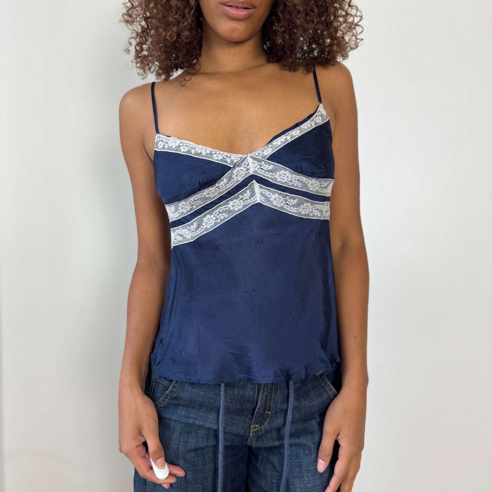 Elegant vintage satin cami by United Colors of Benetton in deep navy with delicate white lace trim crossing the bust. Soft satin sheen with a flattering fitted silhouette and adjustable straps for the perfect fit. A timeless romantic piece. Free shipping on bundles <3