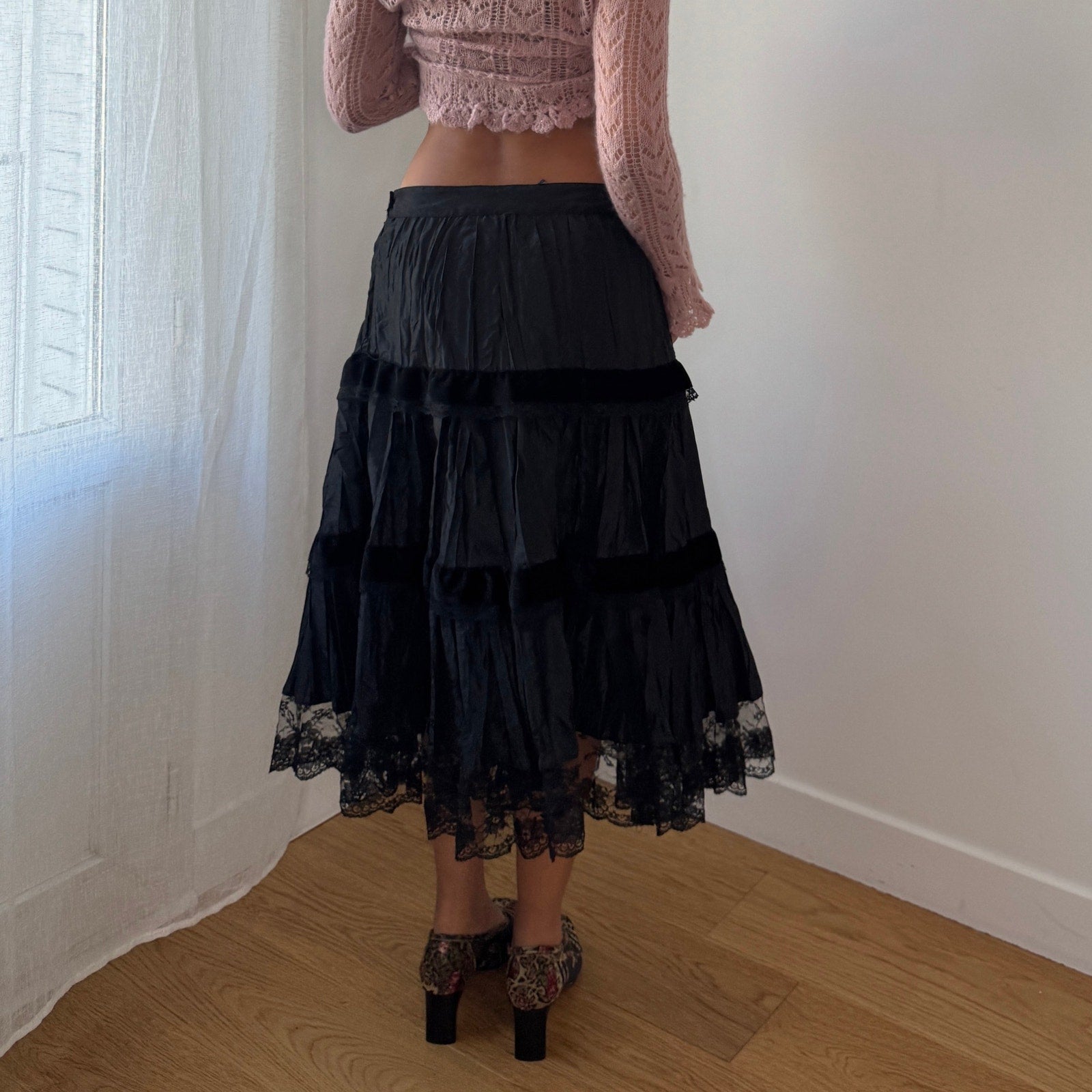 Vintage Italian Black Tiered Midi Skirt Lace Trim (S)