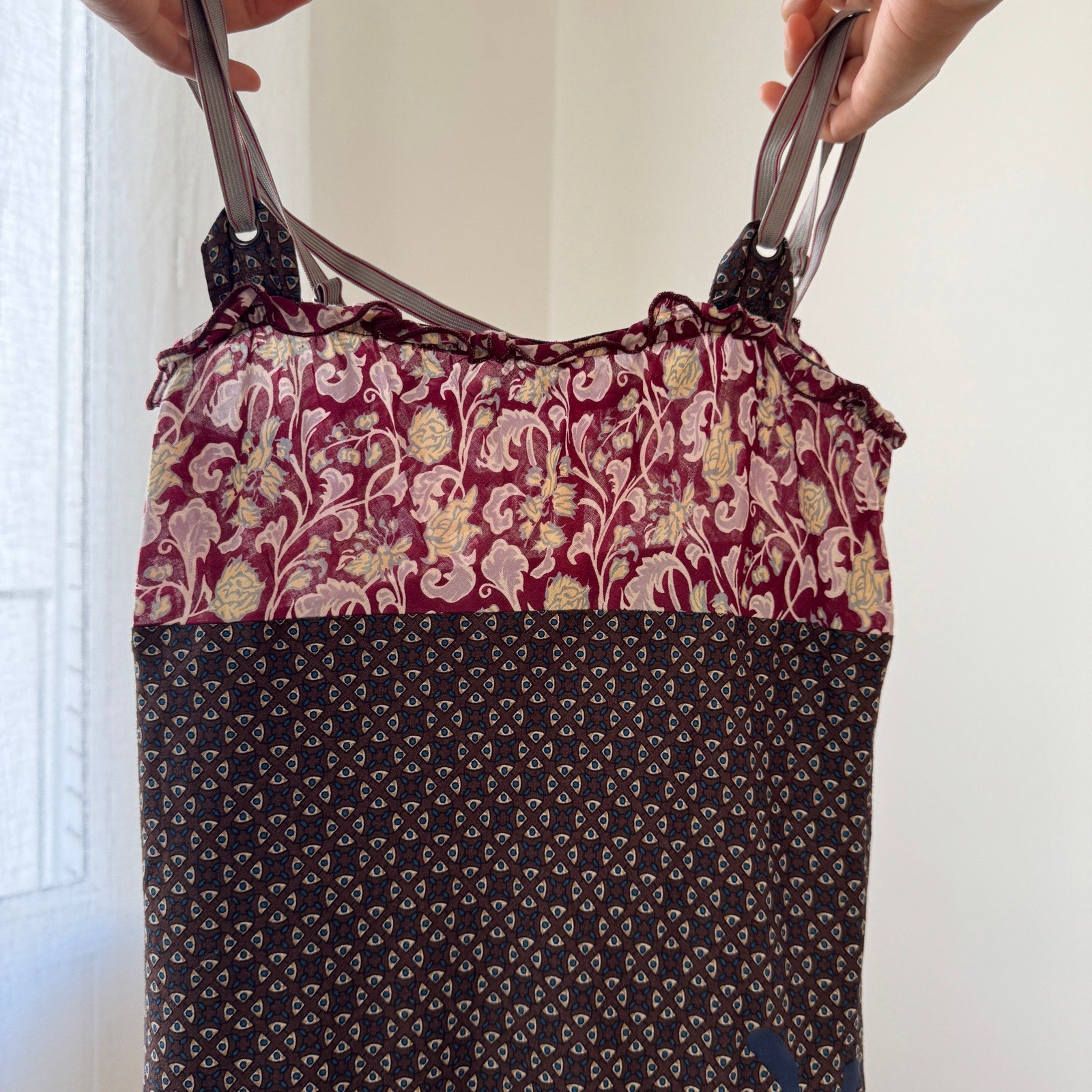 Lightweight 100% cotton with mixed patchwork-style prints throughout; fitted bodice with straight neckline, adjustable shoulder straps, and tiered full-length skirt for movement. By Cop Copine.