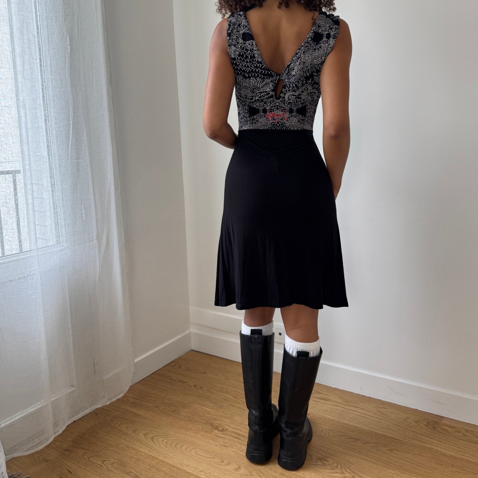 - deep V-neckline with intricate monochrome paisley-inspired print at the bust
