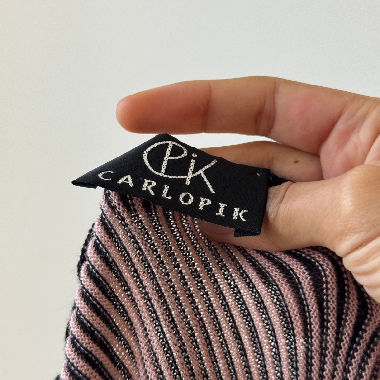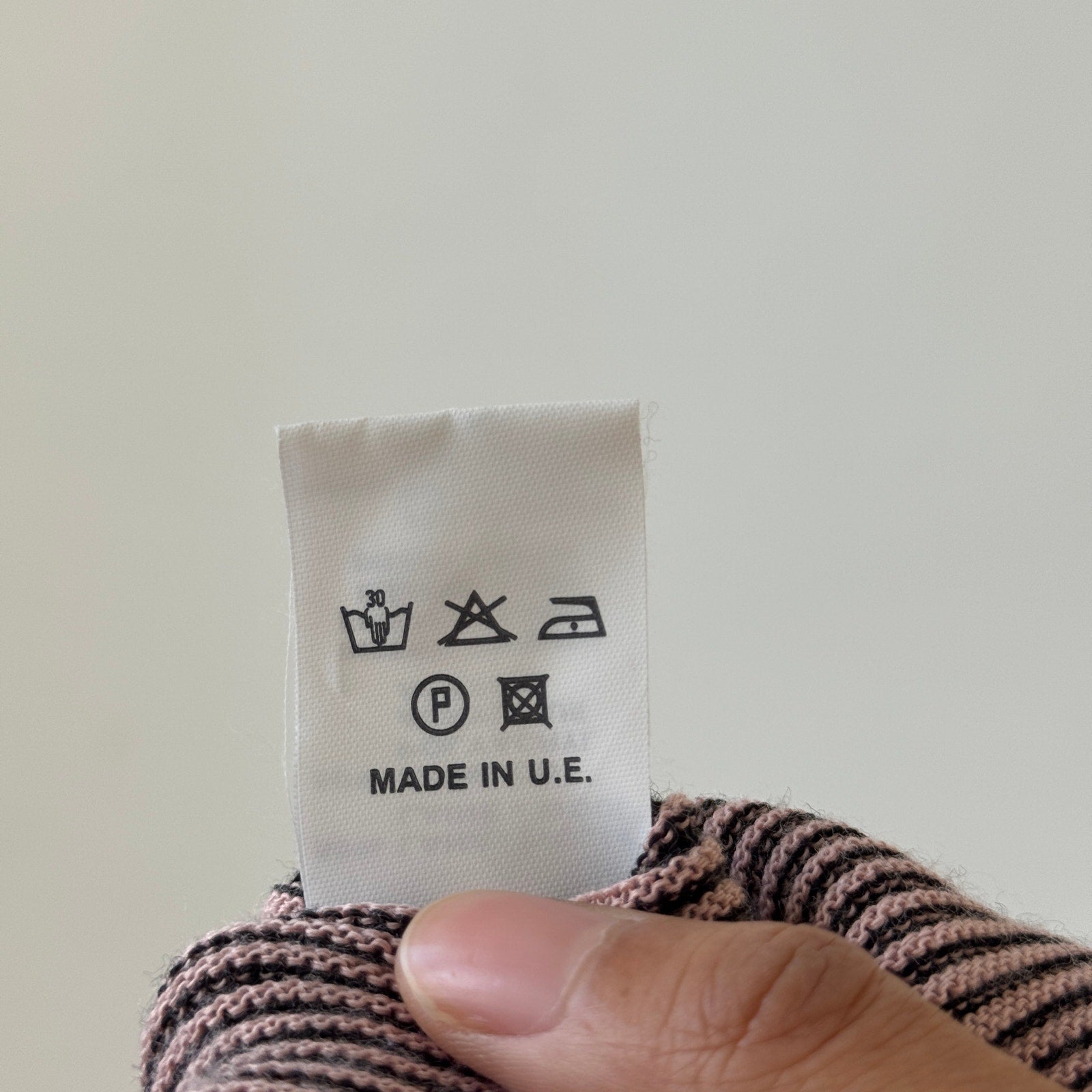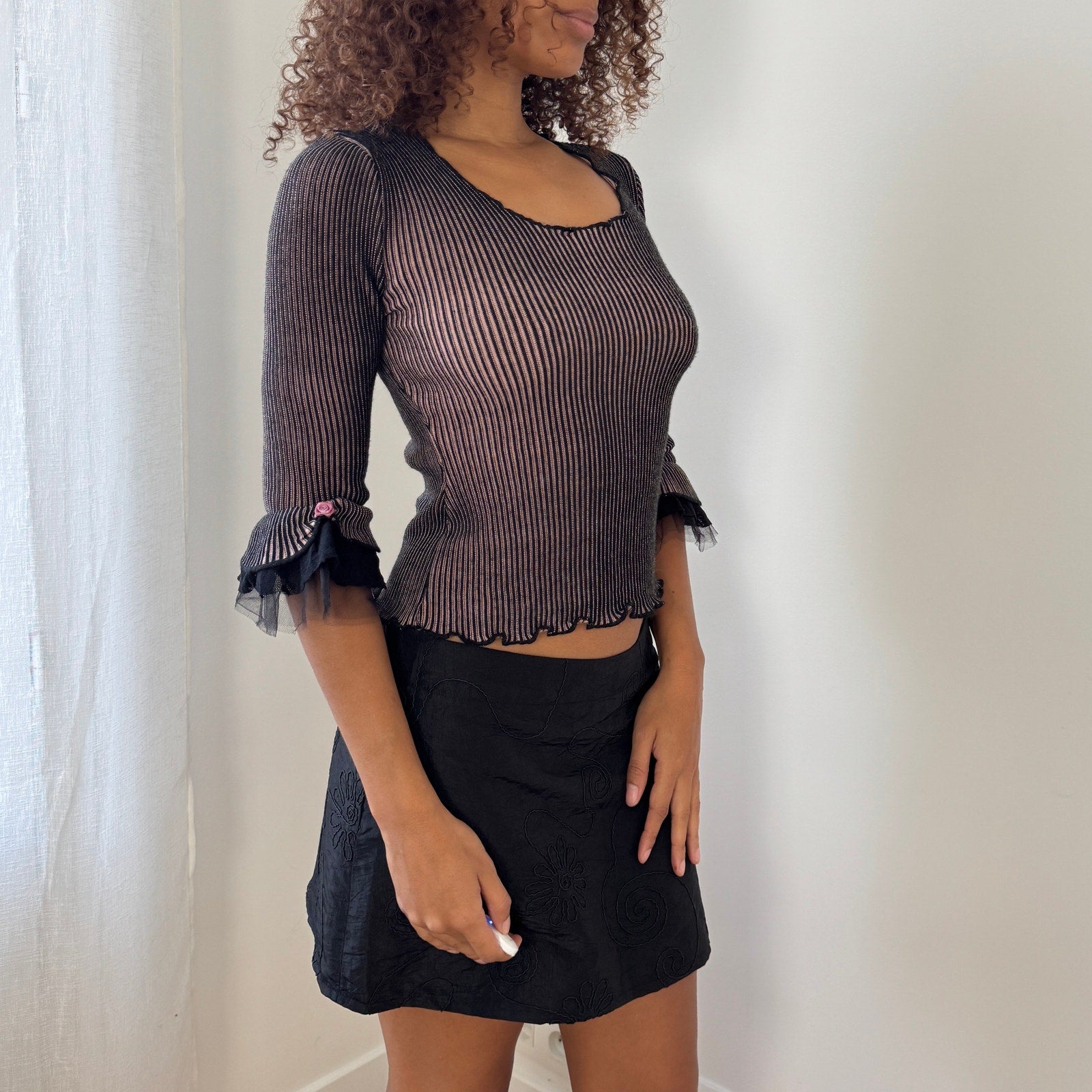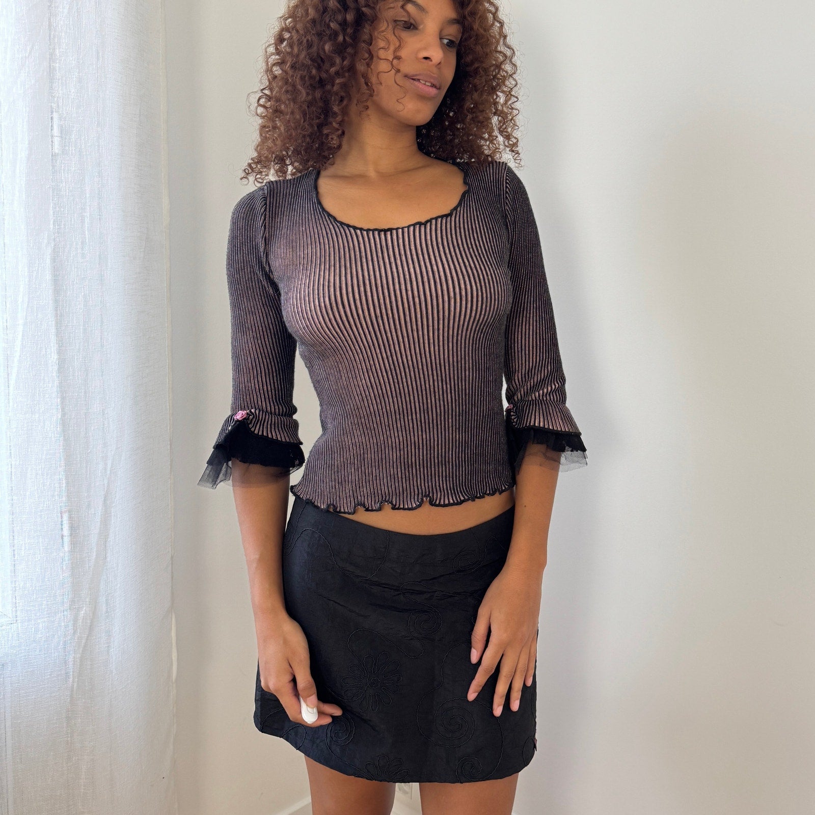 Enchanting vintage Europ knit top in a black and pink ribbed/knit blend. Hugs the body beautifully. The ¾ sleeves are trimmed with layered tulle ruffles and tiny rose appliqués — the sweetest Y2K romantic touch. Lettuce hems throughout give it that delicate, fluttery silhouette.