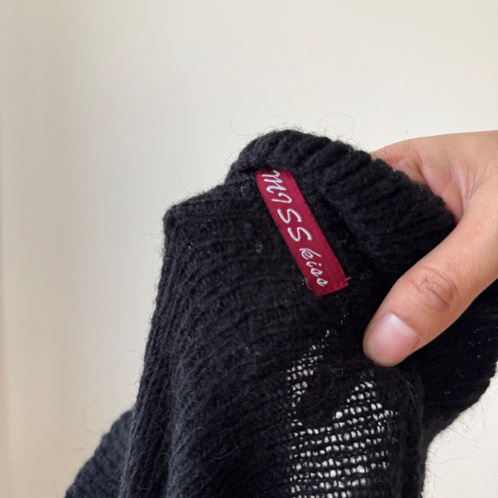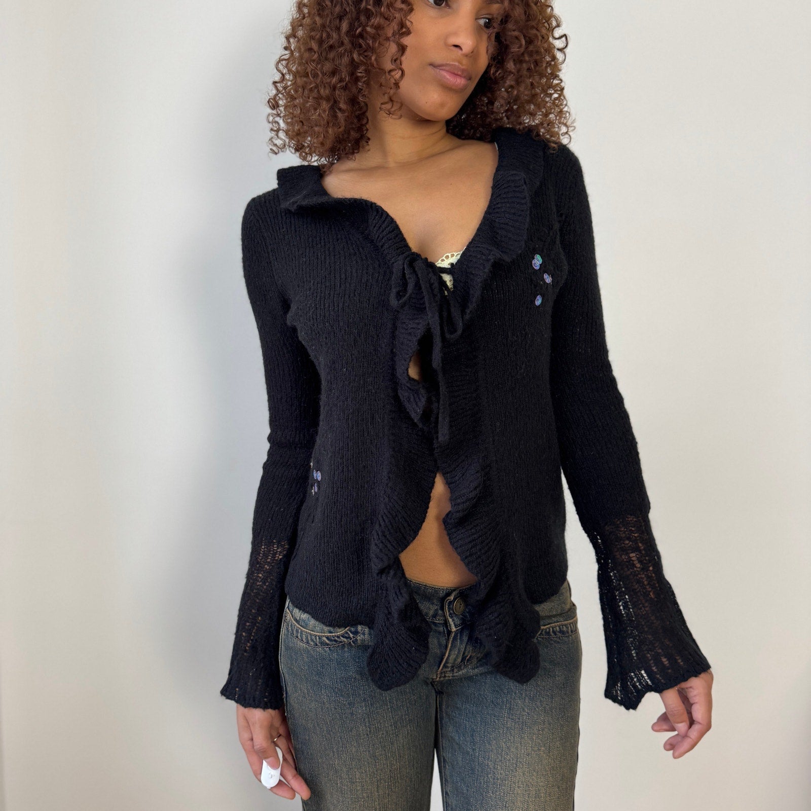 Euro vintage black textured knit cardigan with a tie front closure, soft ruffle trim along the neckline and front opening, and subtle flared semi sheer sleeves. Fitted with small sequin accents.