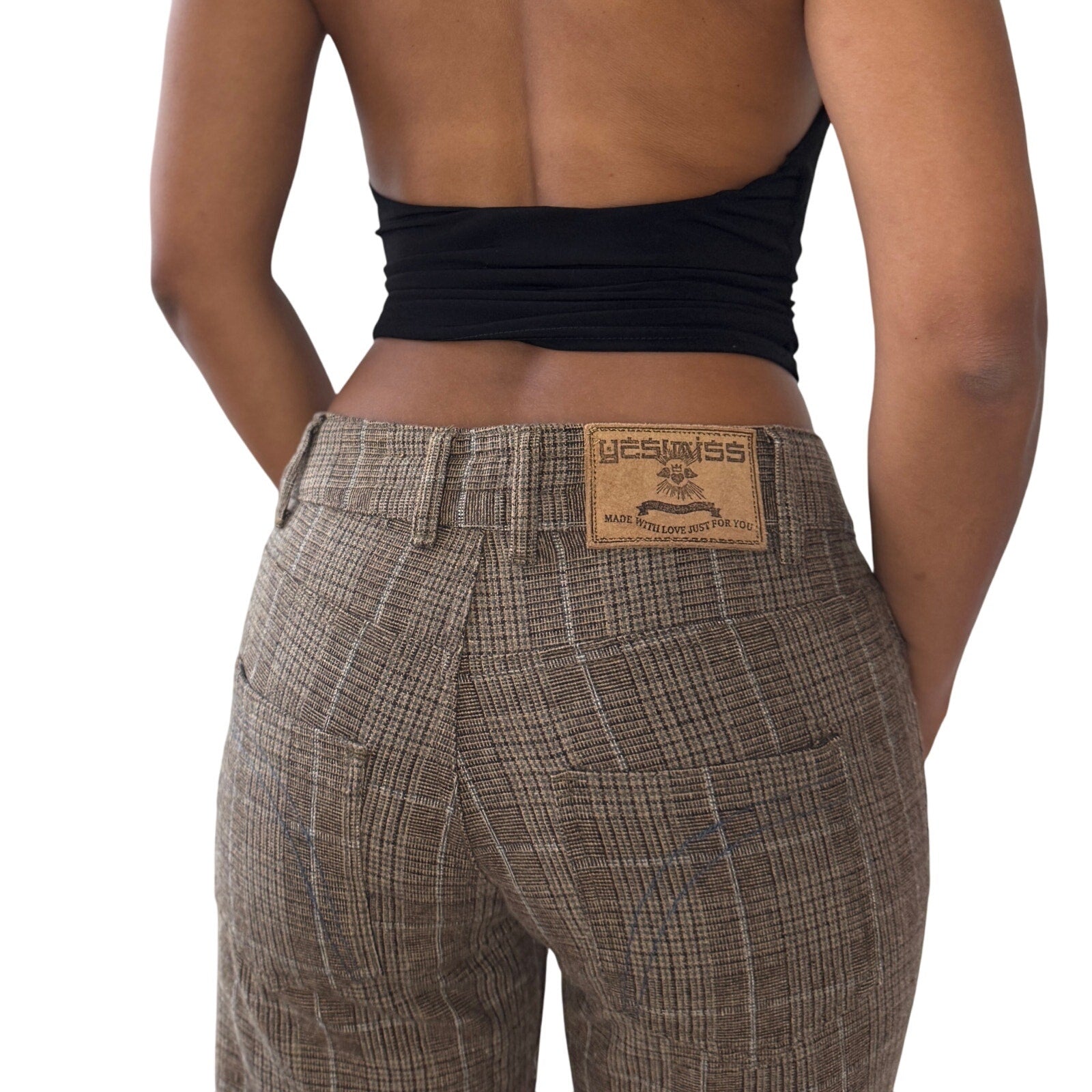 Vintage European capri pants in brown plaid with a tailored fit and cropped length. Classic button-fly closure and structured silhouette. Perfect for fall styling with boots or loafers. 40% wool blend. Free shipping on bundles <3