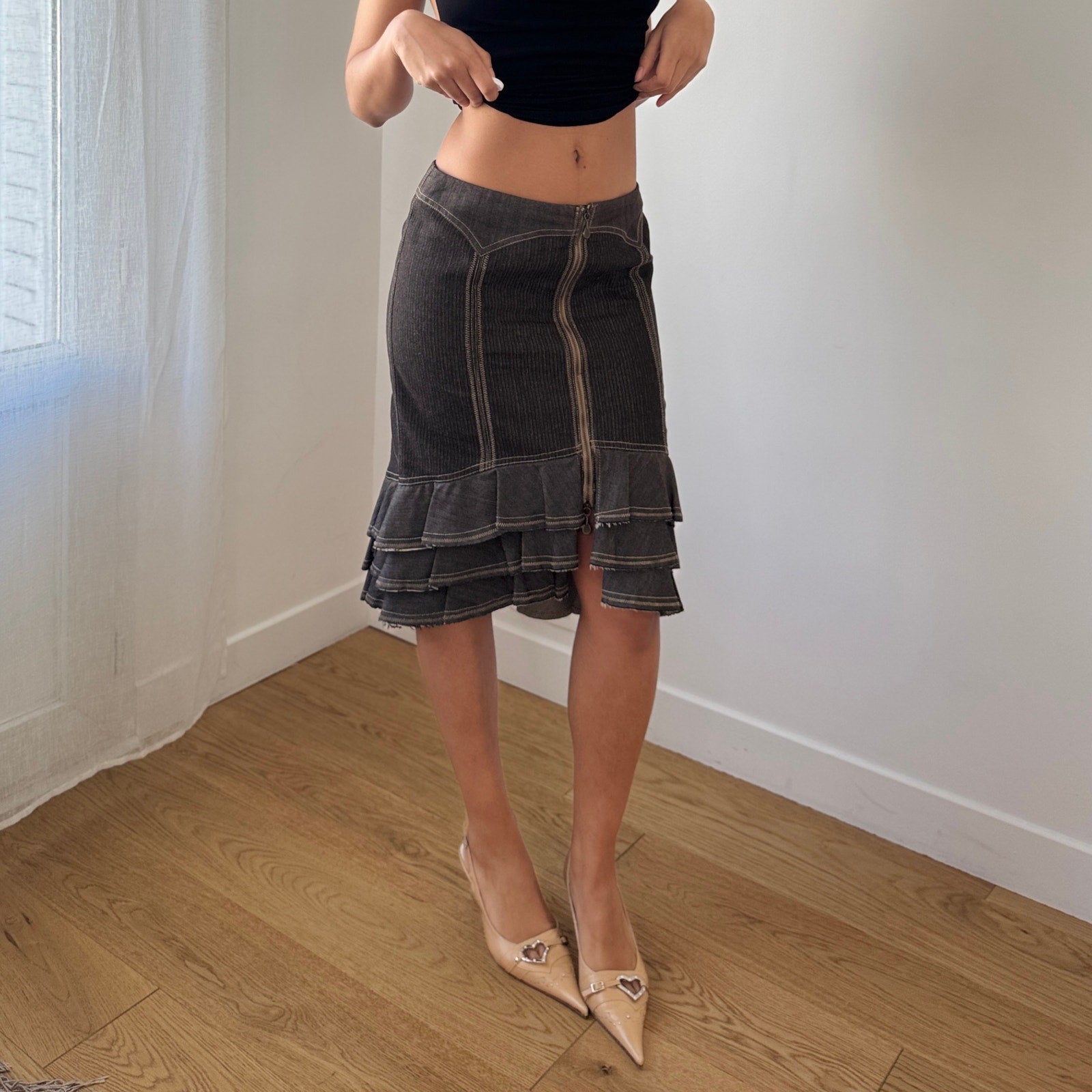 Vintage euro midi skirt crafted from structured denim featuring contrast stitching throughout for a defined, panelled look. Designed with a fitted silhouette and finished with a soft ruffle hem for a subtle feminine touch. Classic yet elevated everyday piece