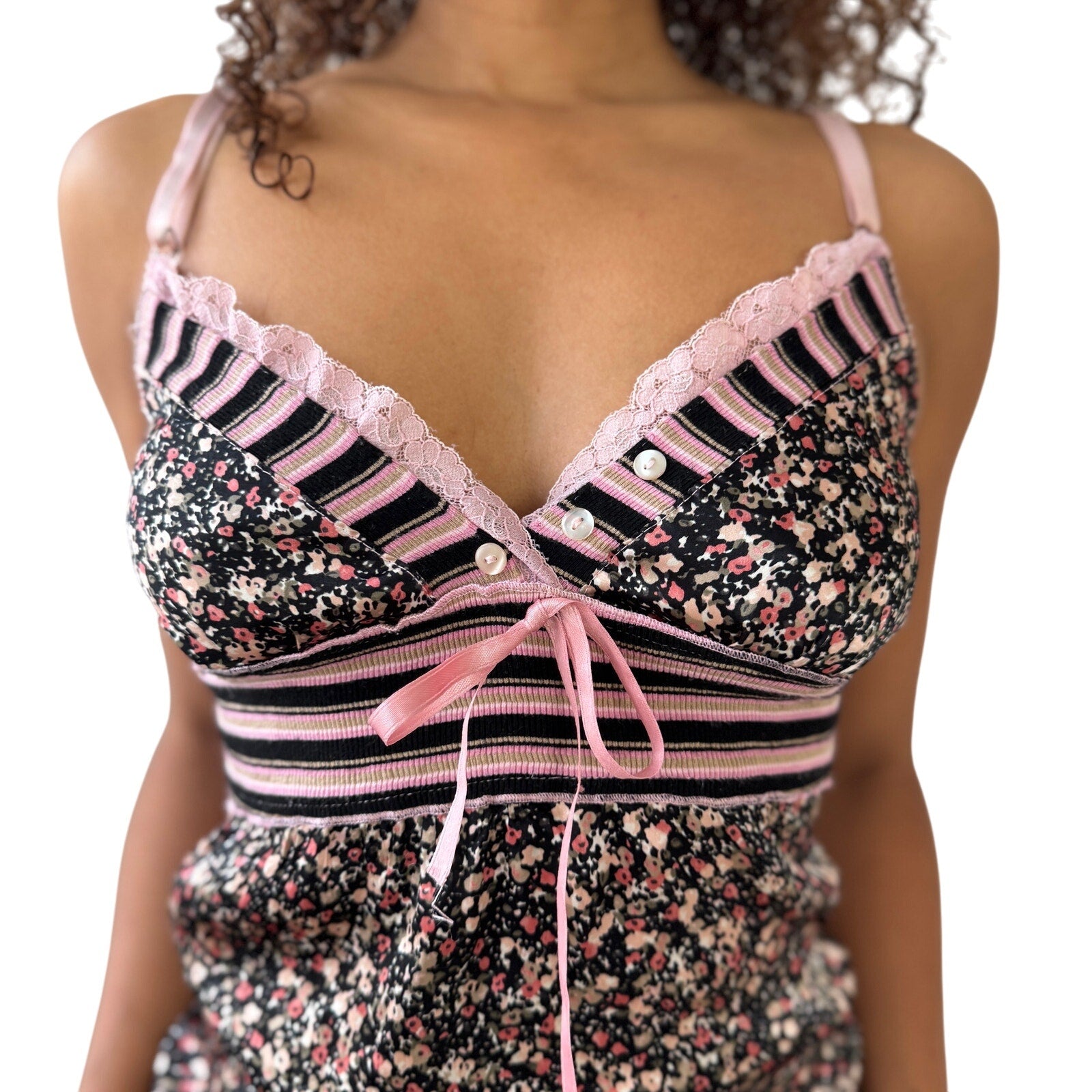 Dreamy mixed-texture Euro vintage camisole featuring the sweetest contrast of a glossy satin floral front, ribbed knit striped panels, and delicate pink lace trim. Finished with a tiny bow tie at the bust and adjustable satin straps for the perfect fit. The back is fully rib-knit, giving it that stretchy, flattering silhouette that hugs without squeezing. Soft, feminine, and effortlessly early-2000s.