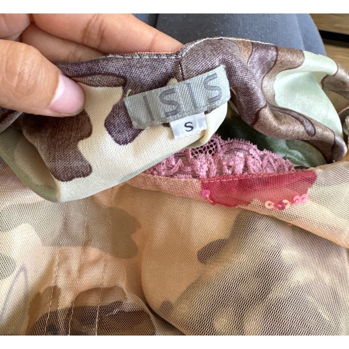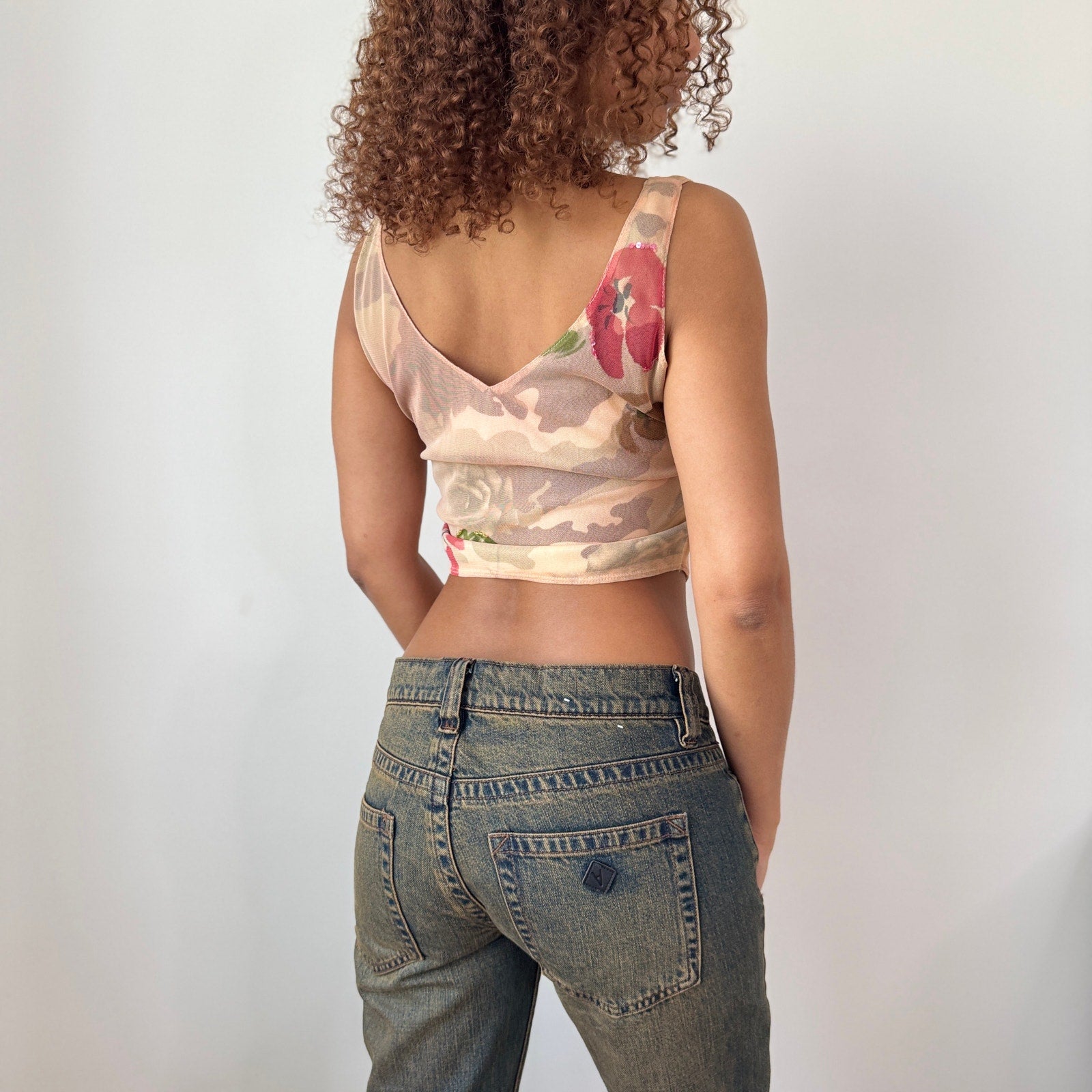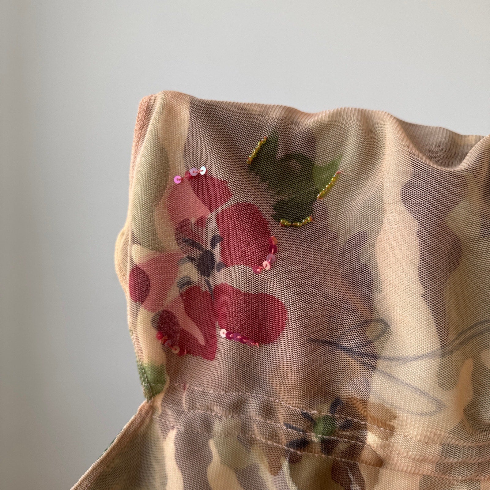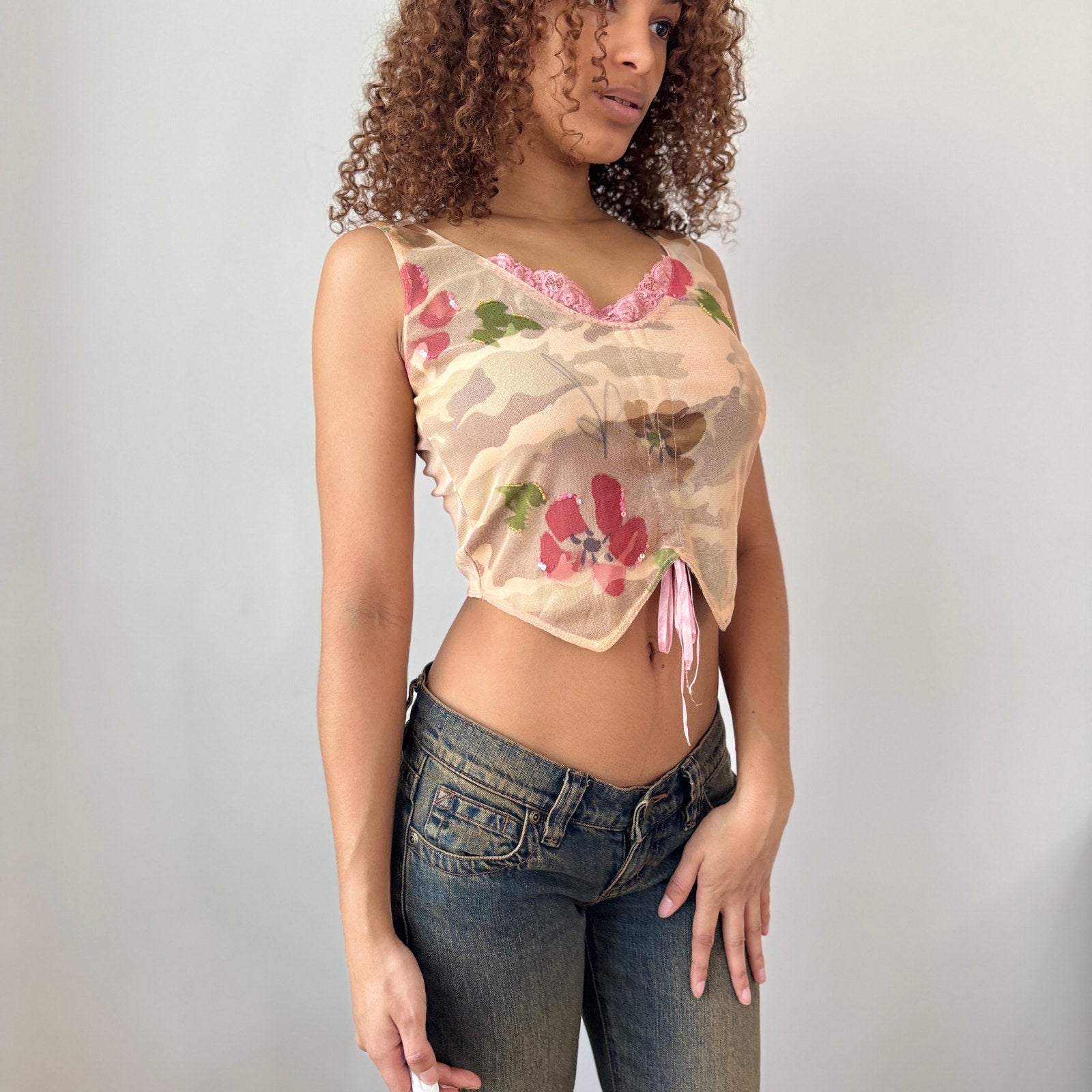 Vintage euro mesh top featuring a soft nude base with delicate floral print and subtle sequin accents. Designed with a scalloped pink lace neckline, double lining at the bust, and a flattering corset-style silhouette with a pointed hem. Adjustable tie detail at the front adds a feminine touch.