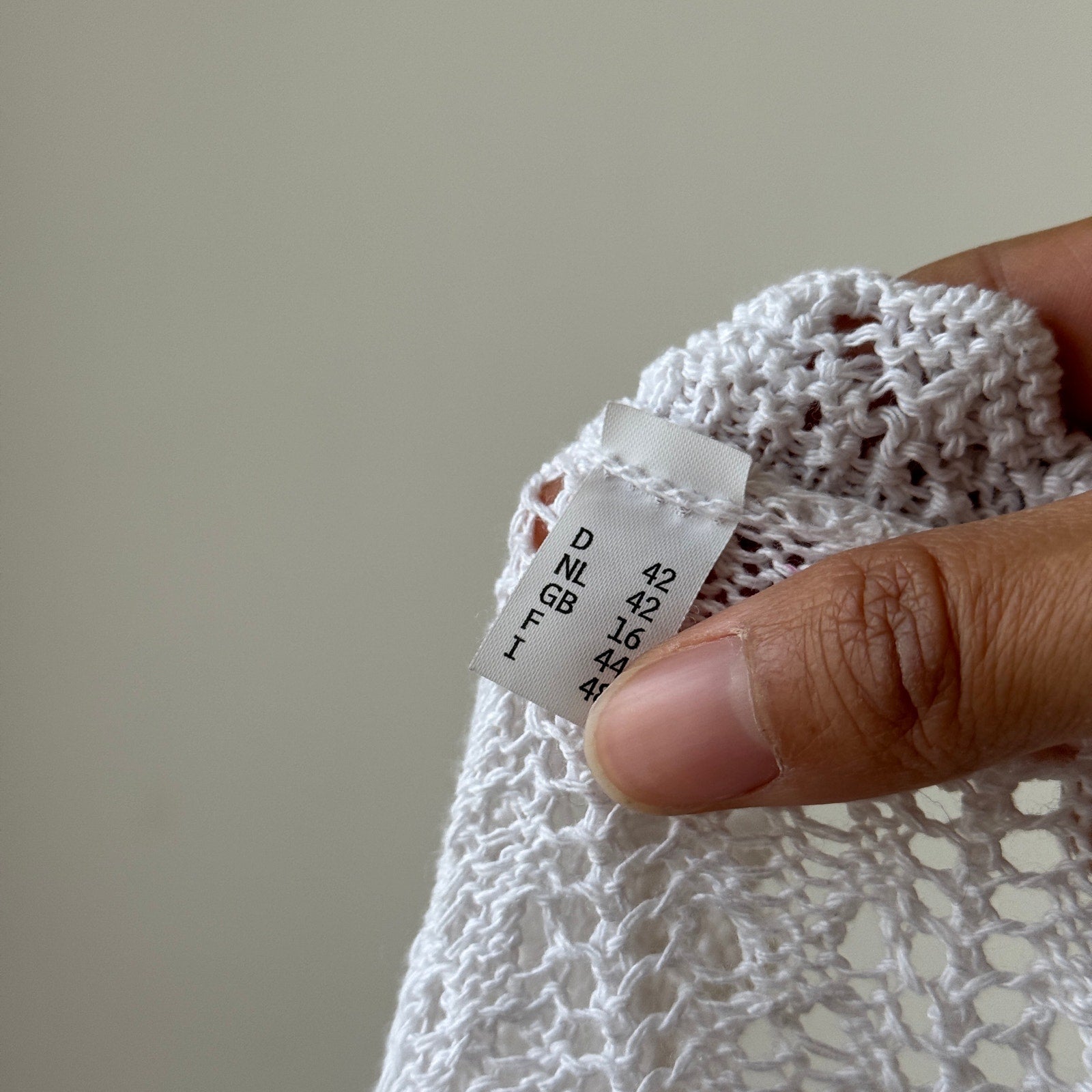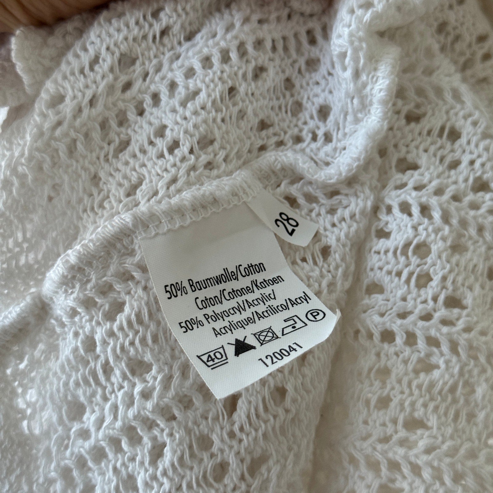 Cotton-blend open knit with a delicate airy texture; cropped silhouette with scalloped edging, long sleeves, and adjustable tie-front closure finished with bead accents. Soft, breathable, and slightly stretchy with a body-skimming drape. Euro vintage.