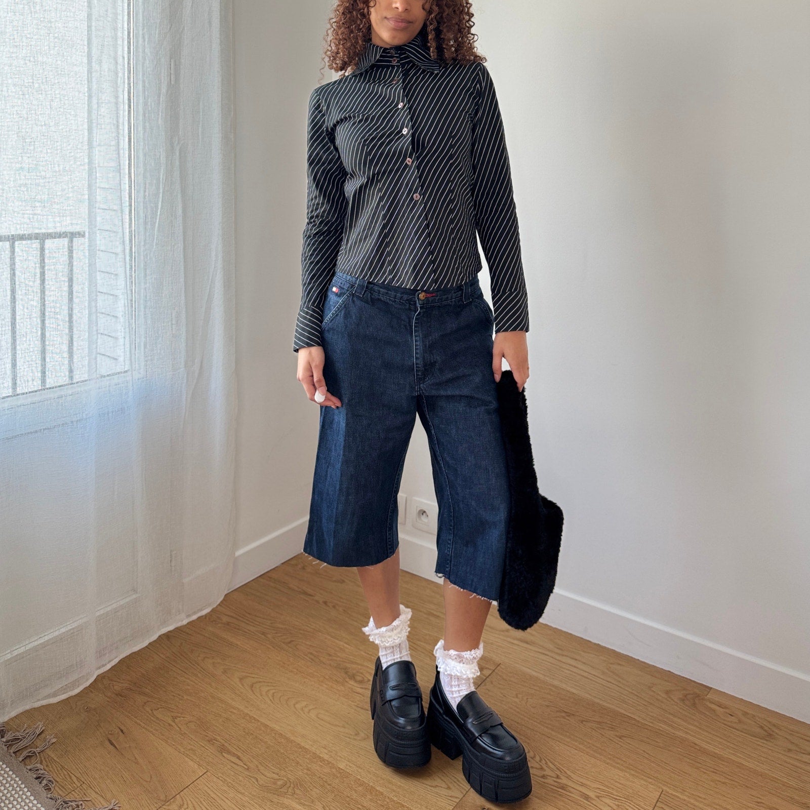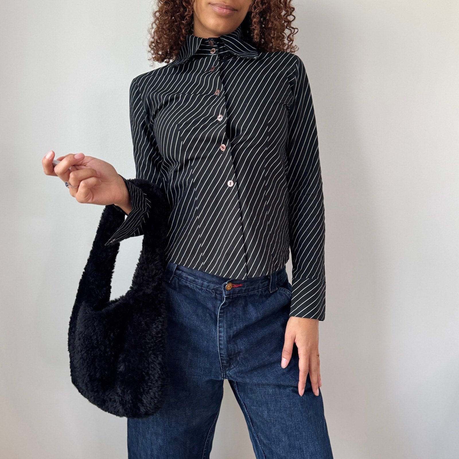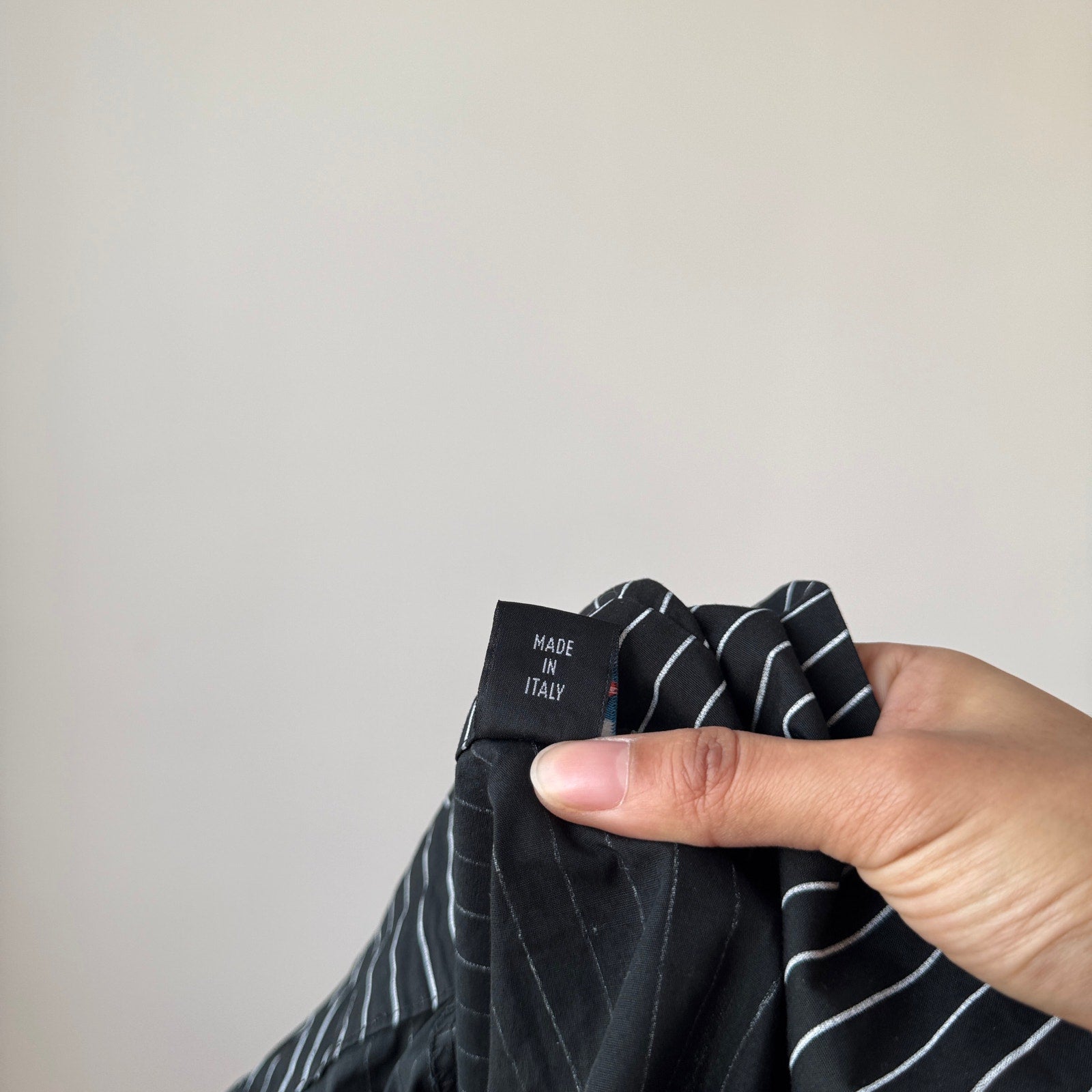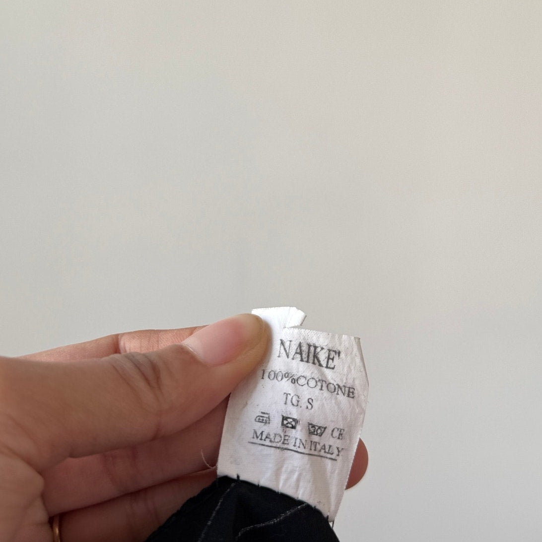 Italian vintage button up shirt crafted from 100% cotton featuring a black base with white pinstripe pattern, fitted silhouette, and pointed collar with front button closure. Lightweight structured fabric with slight stretch through the body. Made in Italy.