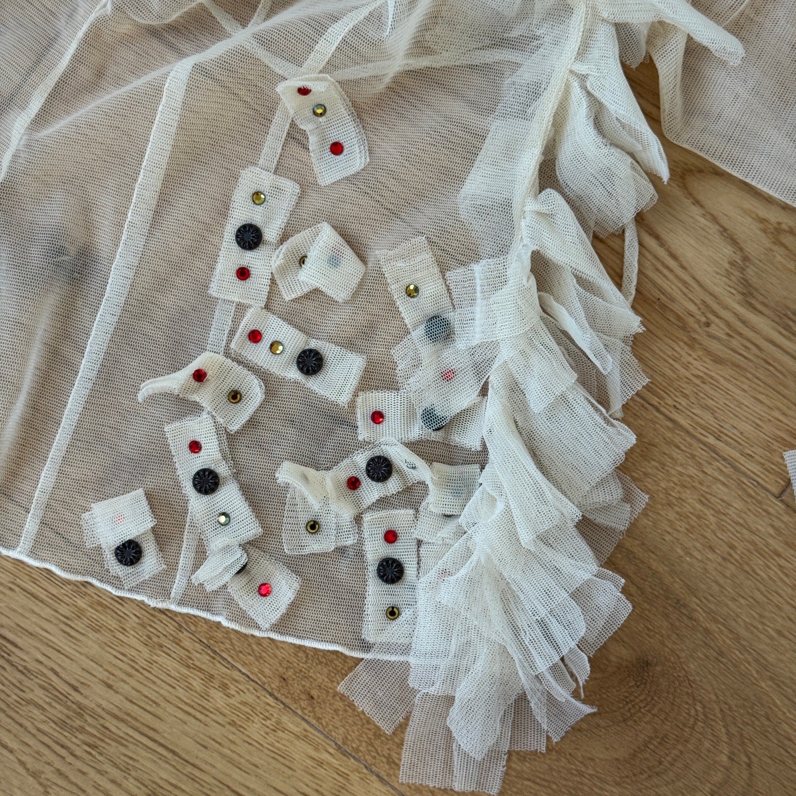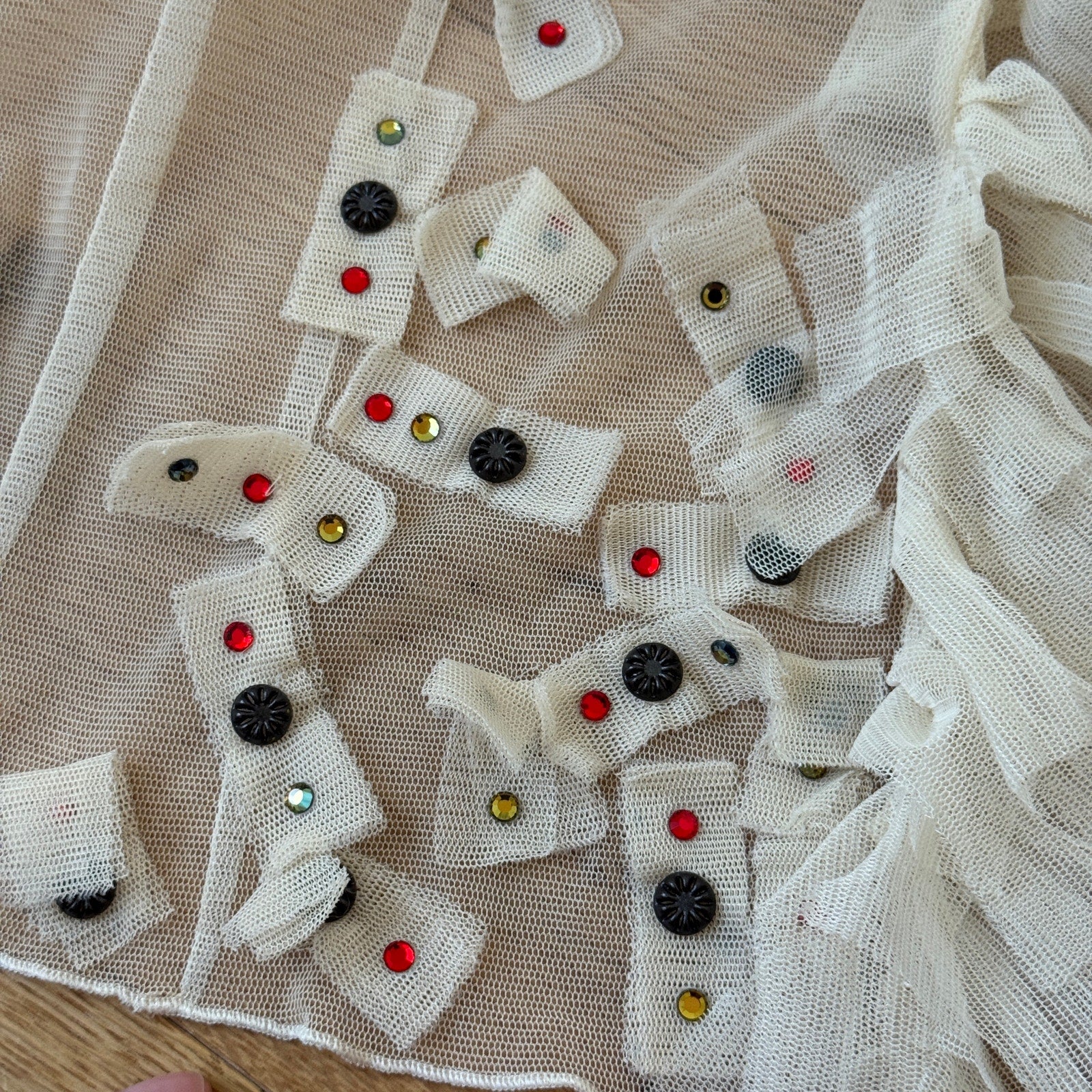 Ethereal vintage Italian sheer mesh blouse featuring dramatic cascading ruffle trim, hand-applied tulle appliqués, and tiny bead accents throughout. Tie-front closure with fluttery cuffs and a soft romantic drape. Ultra whimsical, avant-garde, and collector-level — a true wearable art piece. Made in Italy. Free shipping on bundles <3