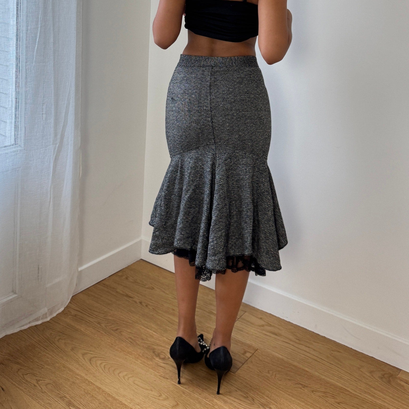 Vintage Italian grey tweed wool blend midi skirt with asymmetric flared hem and black lace underlayer (XS)