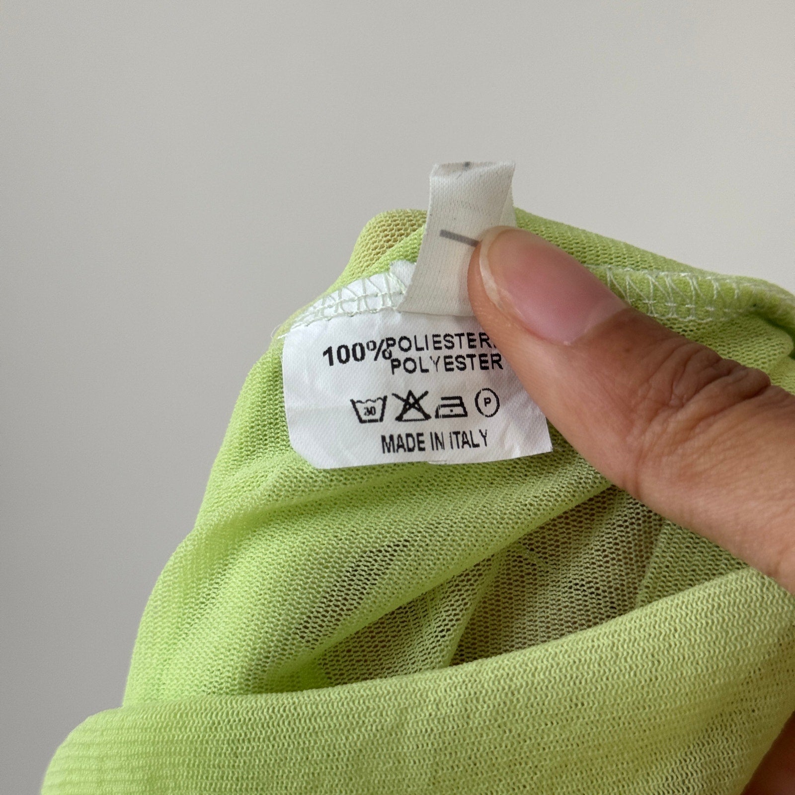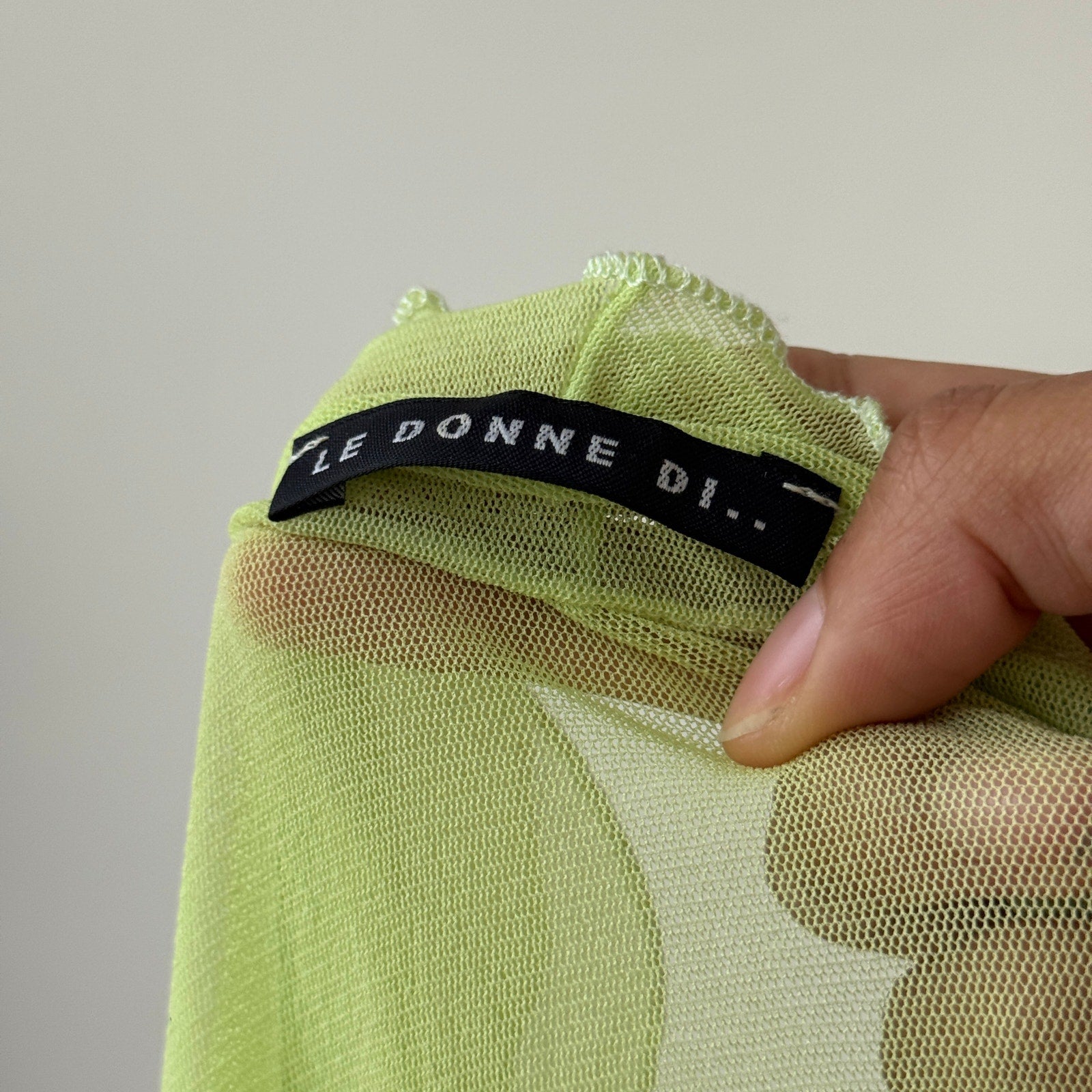 Delicate Italian-made mesh top in a soft lime hue, featuring a romantic ruffled neckline and sleeve edges with a fitted, semi-sheer silhouette. A rare early 2000s-inspired piece that adds a feminine yet playful touch.