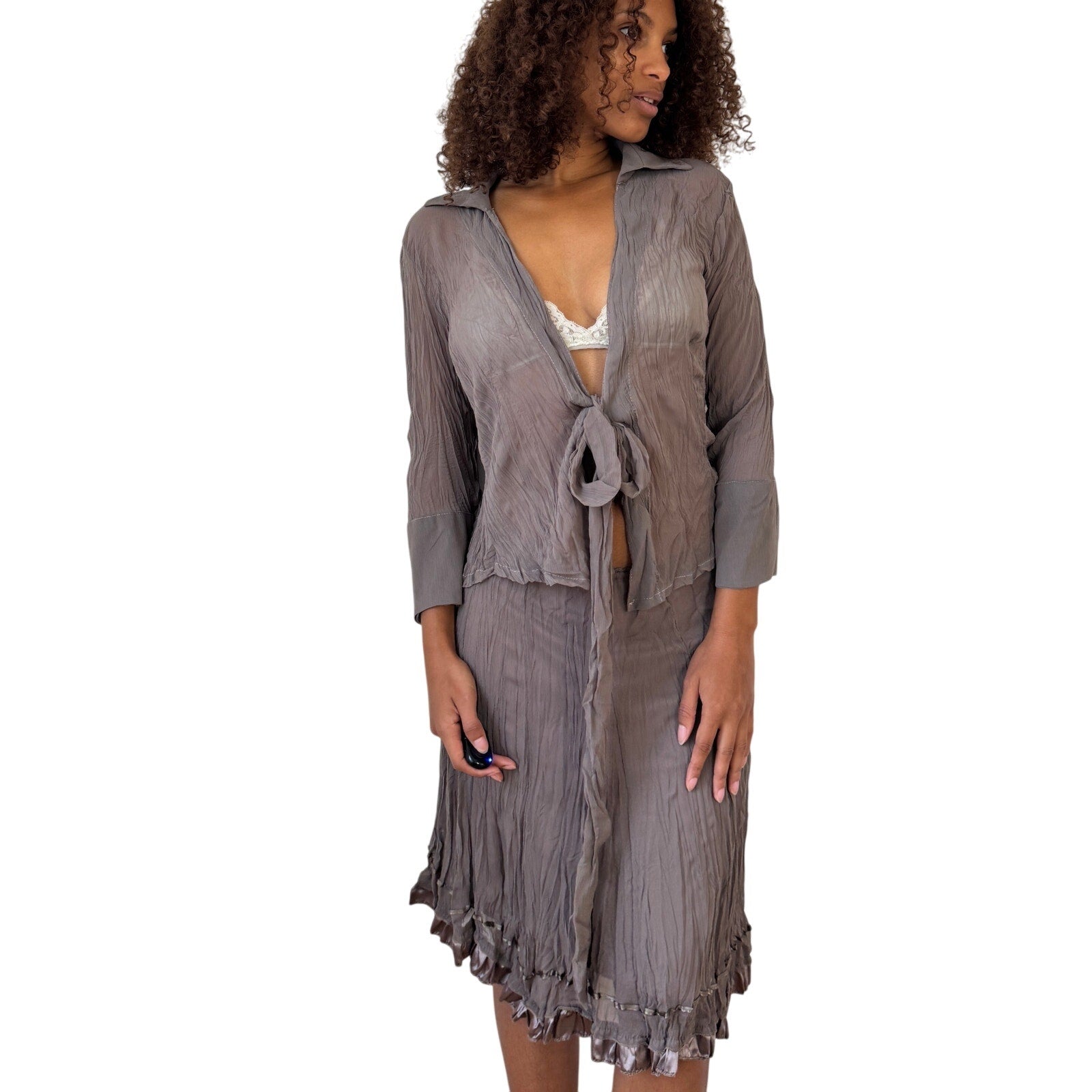 Gorgeous made in Italy sheer mesh blouse with a crinkled finish, satin-trimmed cuffs, and a tie-front closure that flatters the waist. The perfect mix of effortless and sultry.