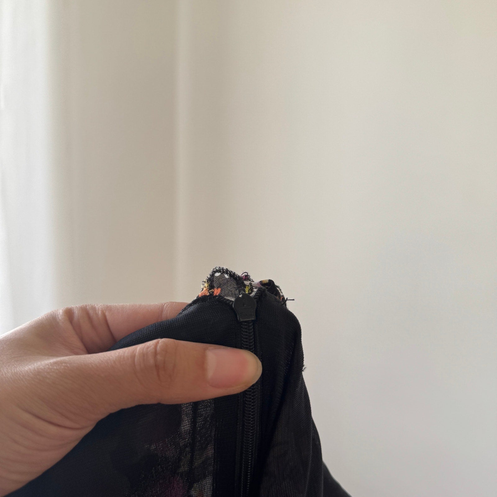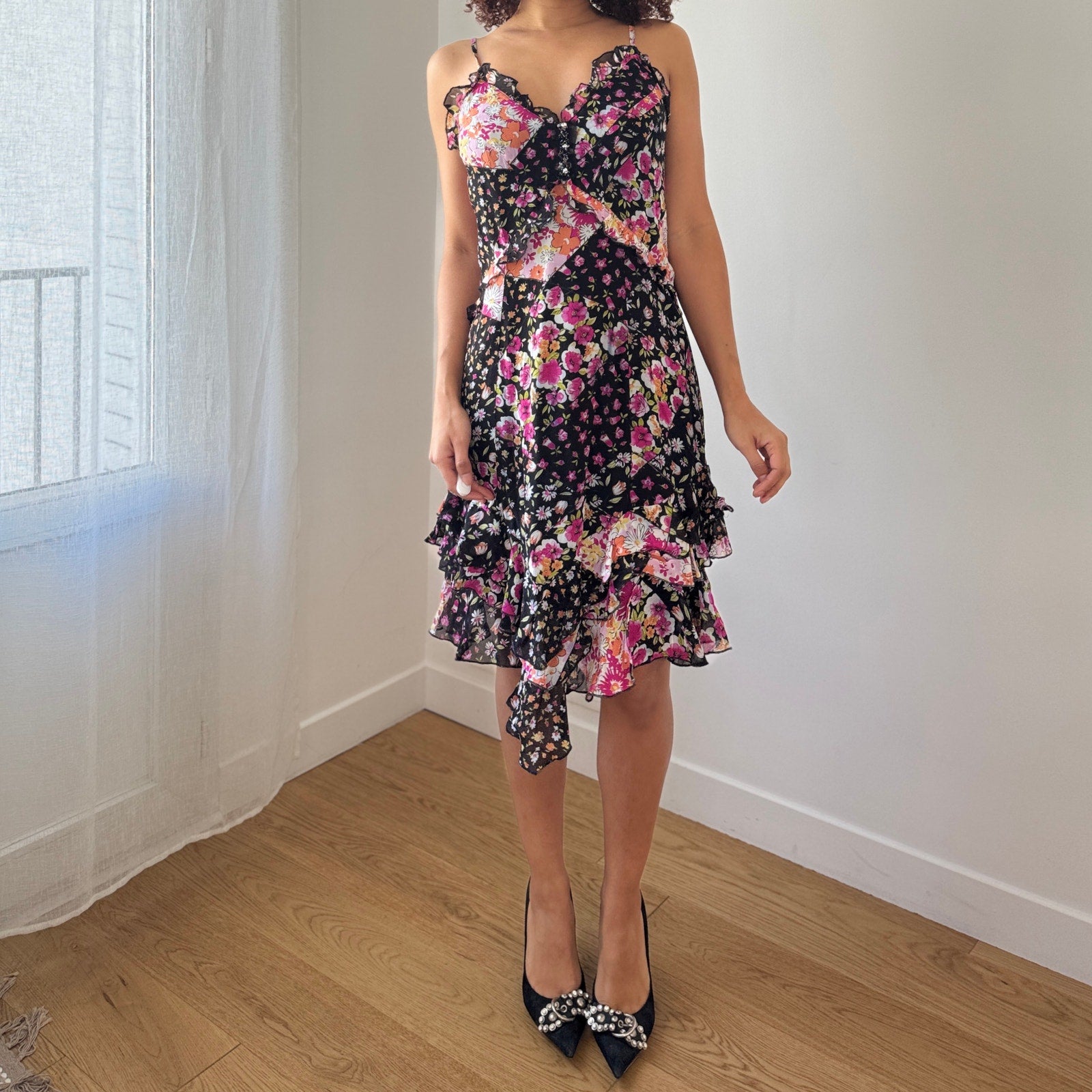 Italian vintage dress crafted from double-lined mesh featuring a vibrant patchwork floral print with mixed patterns in pink, orange, and black tones. Designed with delicate ruffle trim at the bust and a flattering fitted silhouette. Finished with an asymmetrical ruffle hem for soft movement. Zipper closure.