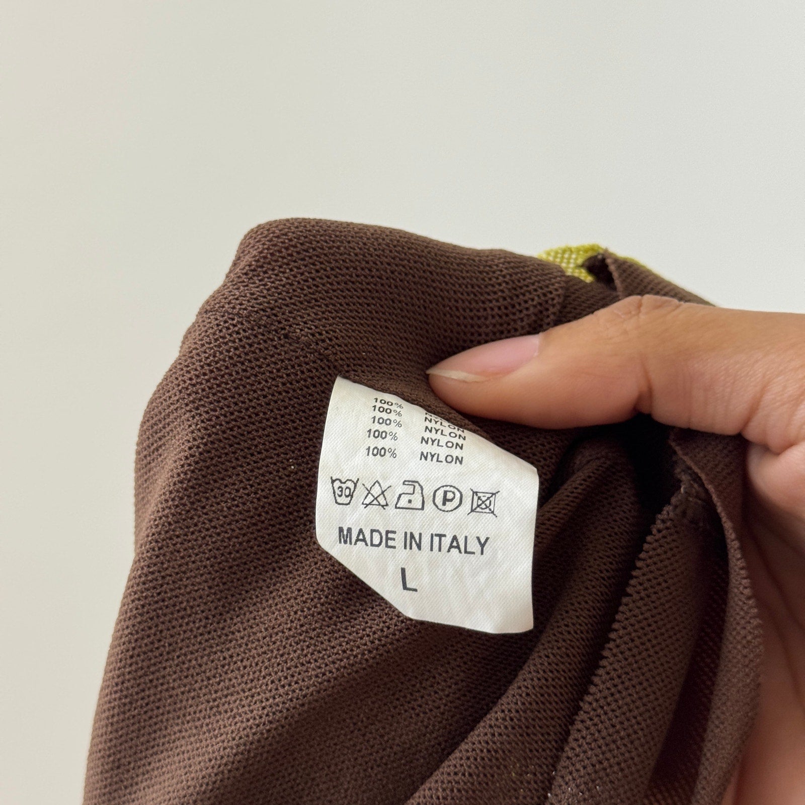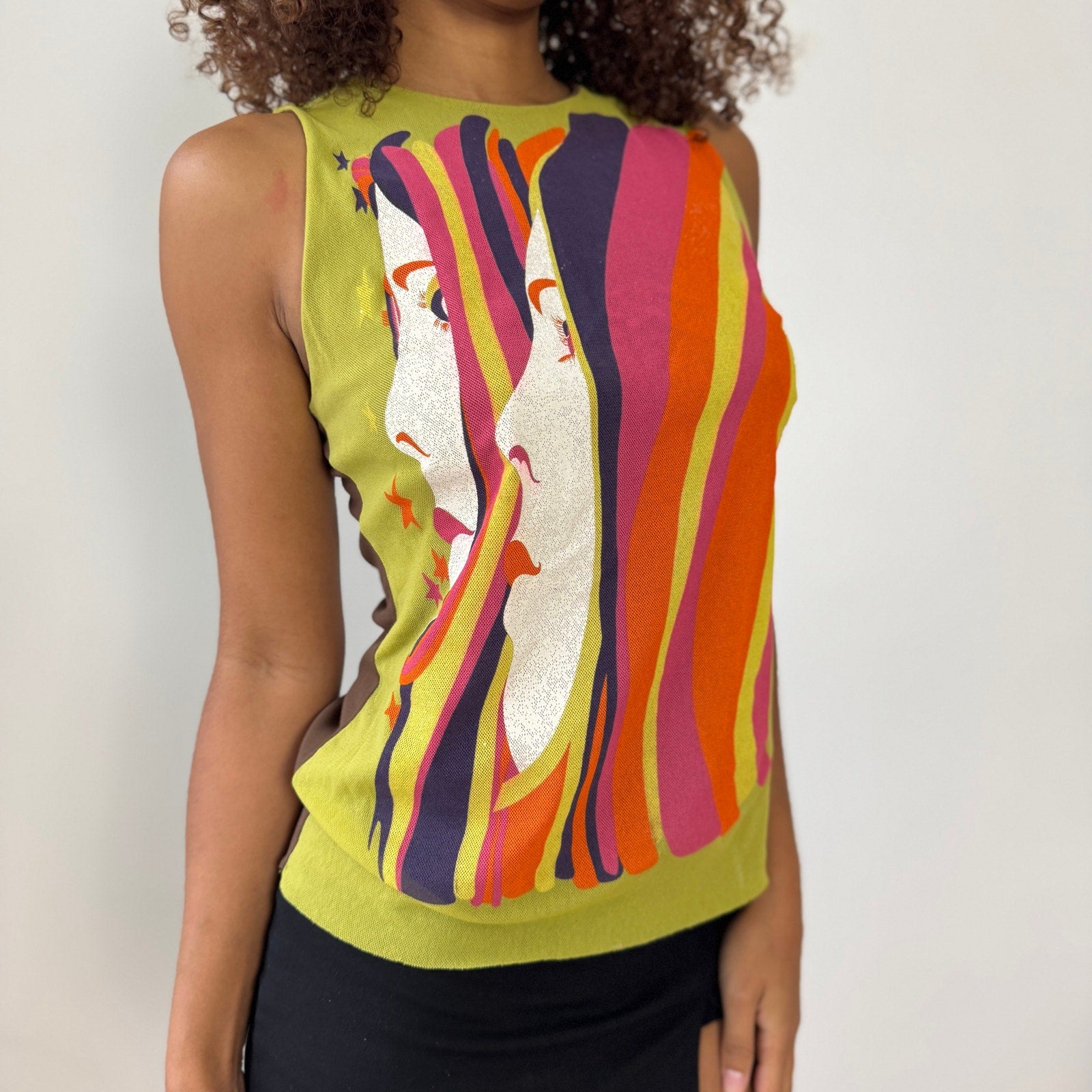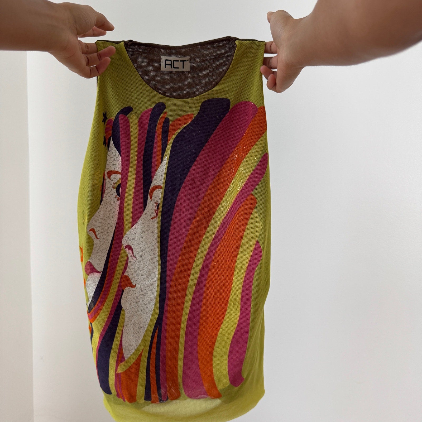 Rare vintage Italian sleeveless mesh top featuring an iconic 70s-inspired psychedelic face graphic in vibrant orange, magenta, purple, and lime tones. Fitted silhouette with soft stretch. Unique, collectible, and true Italian quality. Free shipping on bundles <3