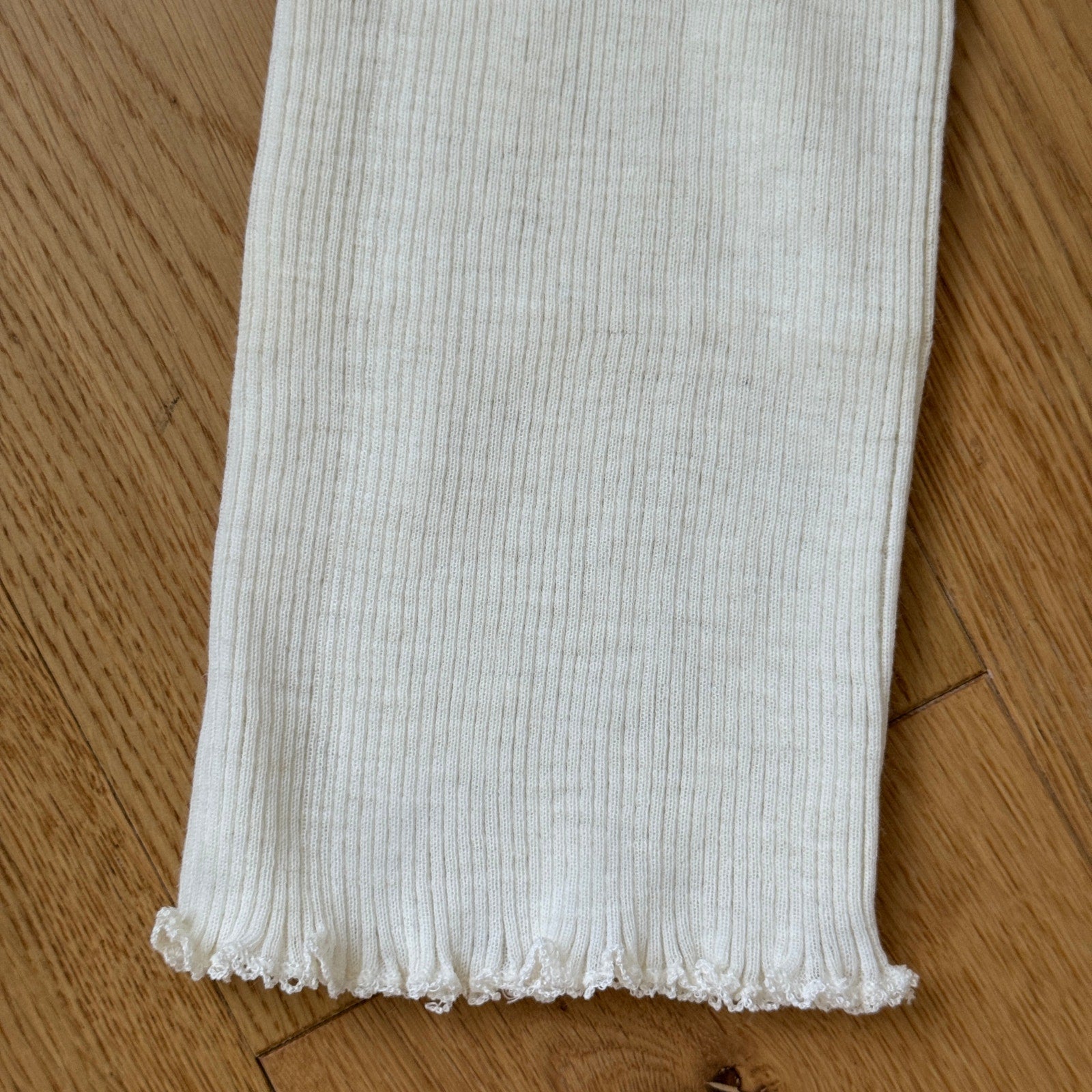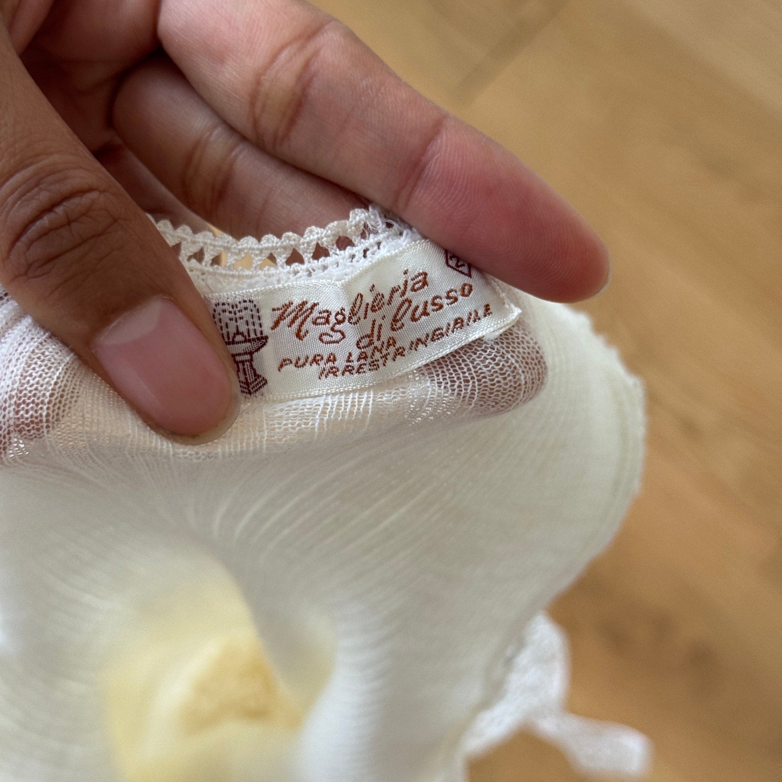 Delicate pure wool (pura lana) knit cami in soft ivory with a ribbed body and lace-trim cups, and skinny straps—romantic meets cozy. “coquette knitwear”. Made in Italy.
