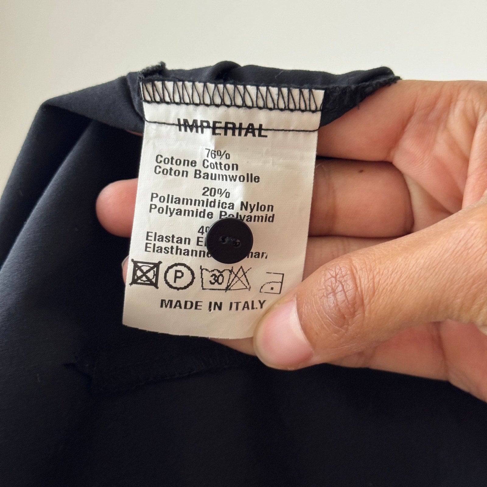 Black cotton-blend poplin blouse with dramatic cascading ruffle placket, puff sleeves and a tailored, darted waist; 76% cotton, classic button-front closure. Made in Italy.