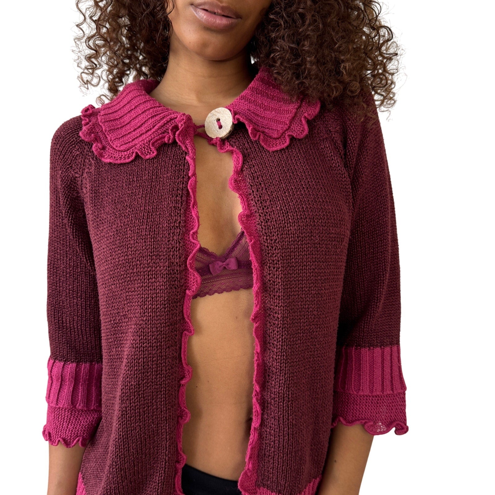 Vintage Jacqueline Riu French ruffled trim knit cardigan in berry & rose (Small)
