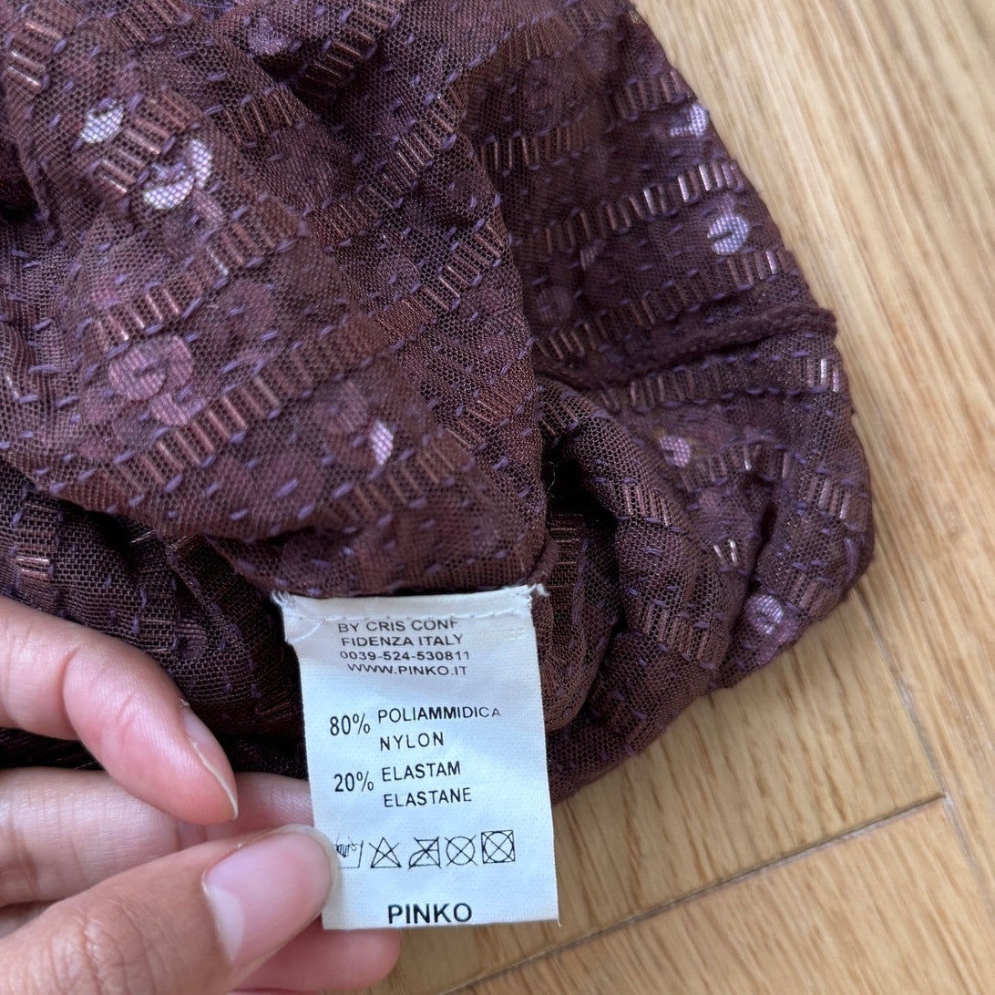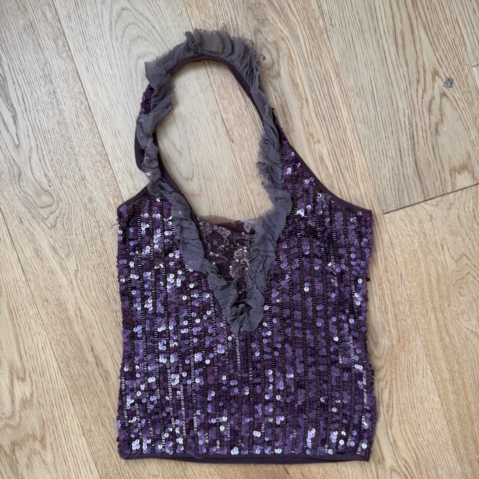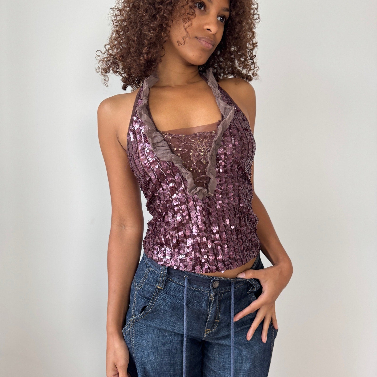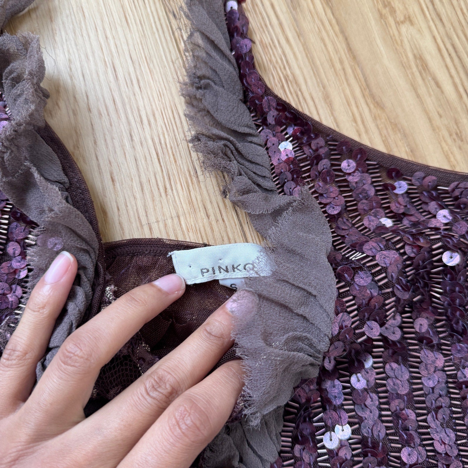 Signature Pinko glam: mauve-plum sequins with vertical beaded accents, sheer mesh illusion panel at the bust, and a ruffled chiffon halter tie neckline. Fitted, stretchy body with an open back—an iconic Y2K going-out top. Italian designer piece.