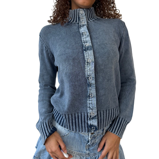 Vintage Euro Slate Blue Knit Satin Snap-Placket Mock Neck Sweater (Small)